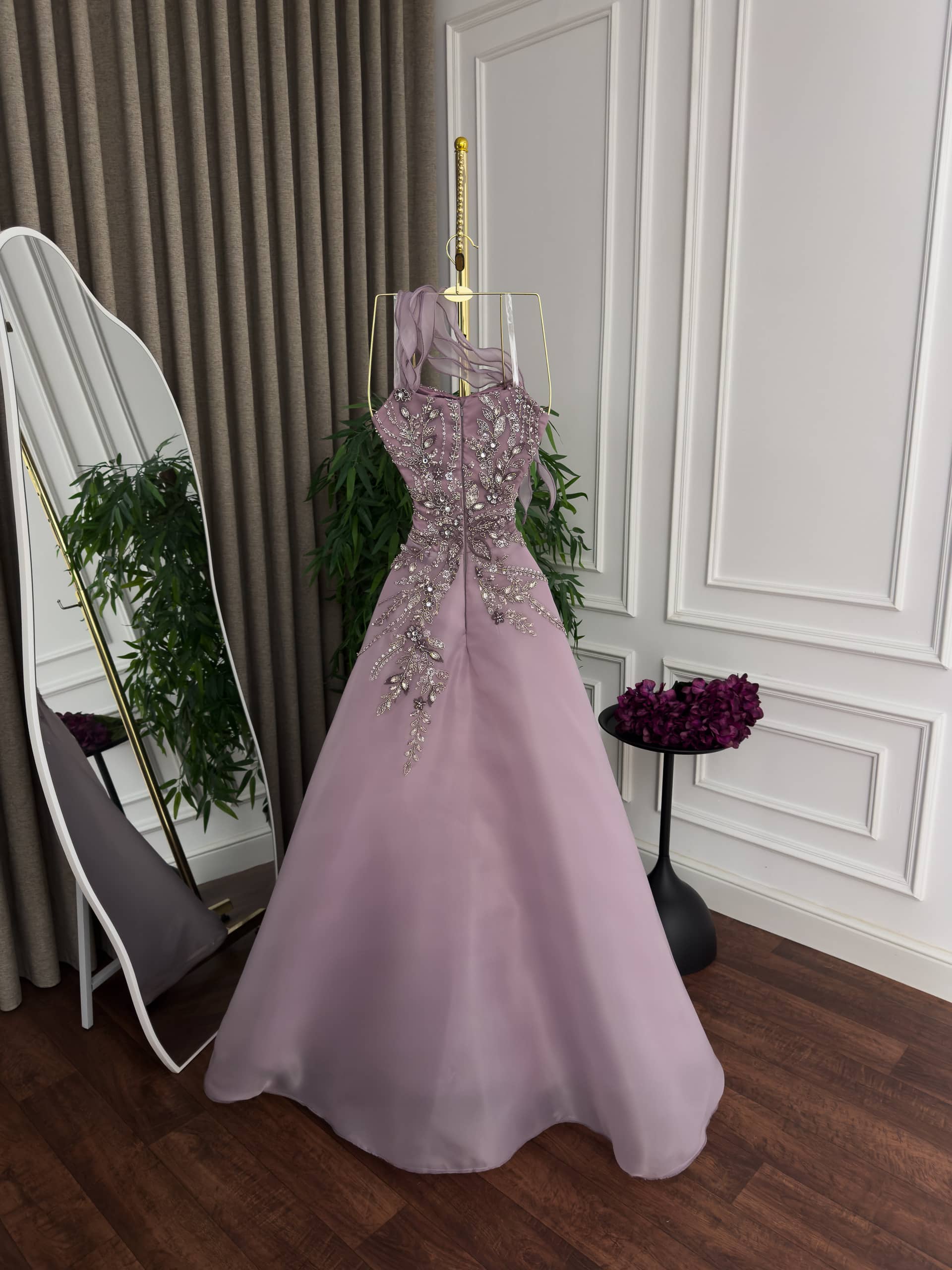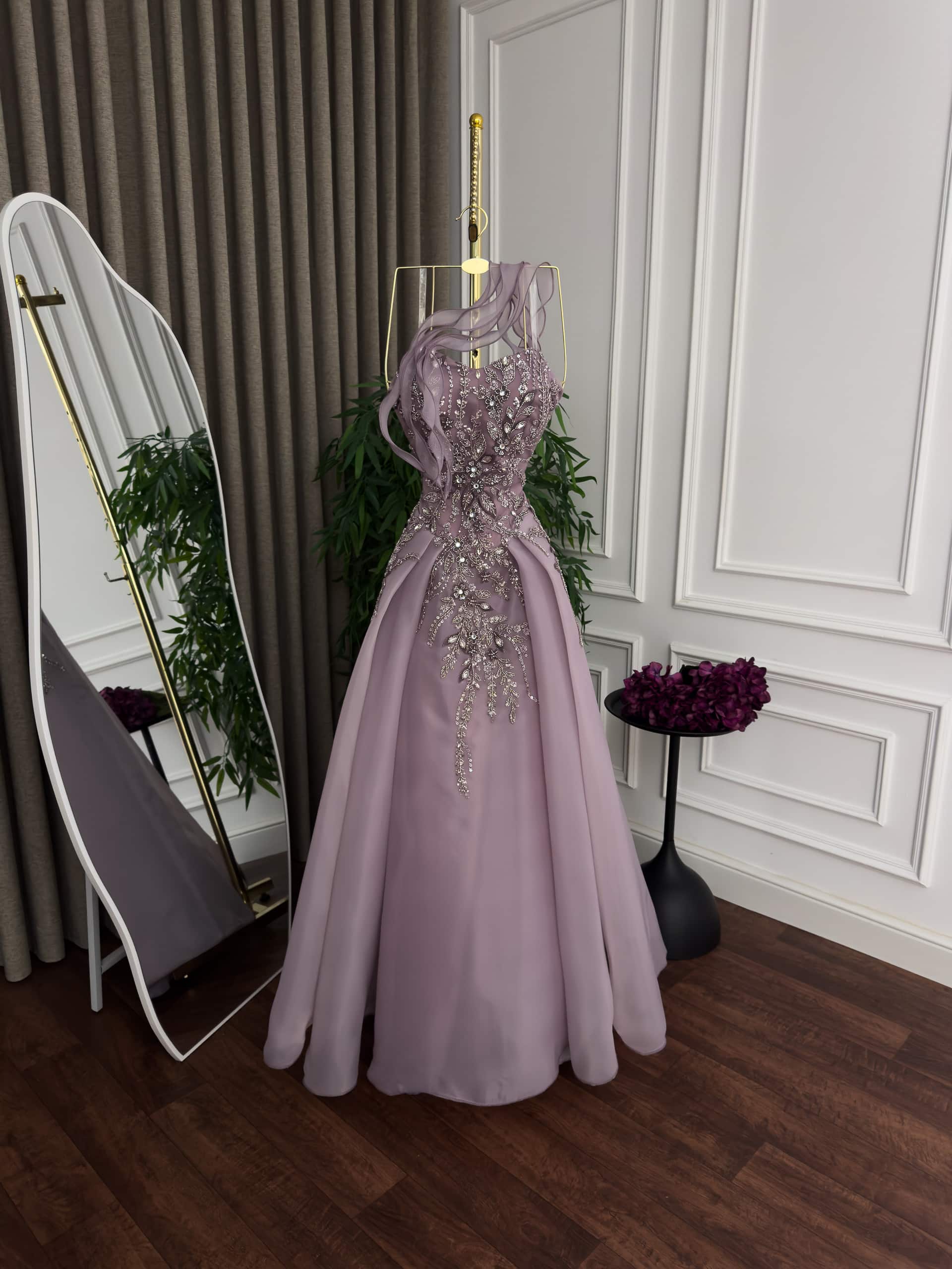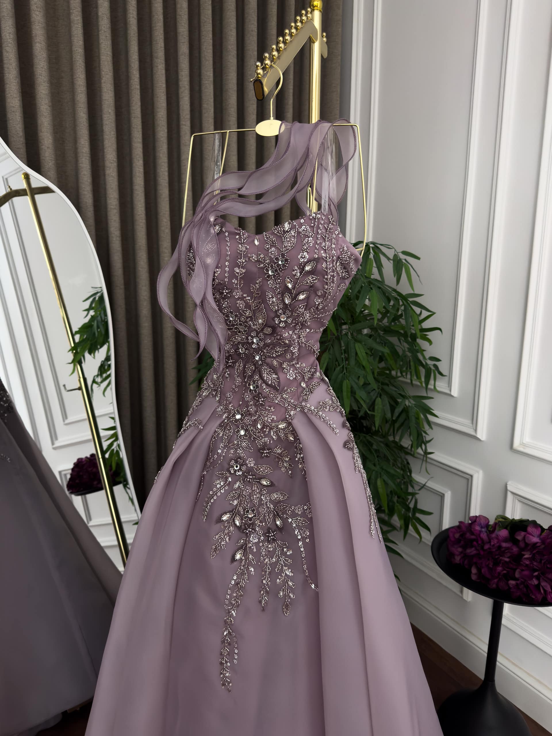 فستان سهرة طويل موف مزخرف بالتطريز الفاخر