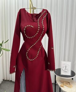 هذا الفستان بلونه الخمري الجذاب يجمع بين الفخامة والذوق العصري. يأتي بتطريز فاخر على الصدر والأكمام مع شق أمامي أنيق يضفي لمسة أنوثة راقية. قصّة الفستان مصممة لإبراز جمال القوام بأسلوب أنثوي متوازن.