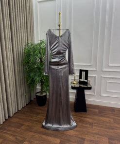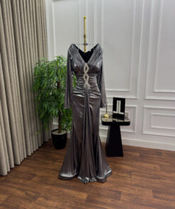 يجمع التصميم بين البساطة والفخامة بخامة لامعة وانسيابية تمنحك تألقًا ساحرًا مع كل حركة، بينما يبرز التطريز الفضي في المنتصف لمسة من الفخامة الملكية.