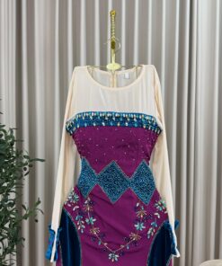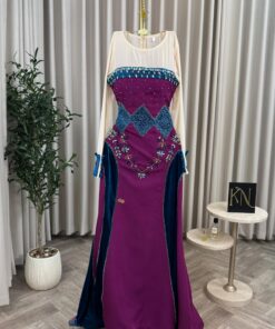 يتميز الفستان بلونه البنفسجي الغني الذي يضفي لمسة من الرقي، ويتناغم ببراعة مع التطريزات اللامعة ذات الألوان المتعددة، مثل الأزرق الفاتح والتركواز، لتخلق تبايناً لافتاً وأنيقاً. الجزء العلوي من الفستان يأتي بلمسة فنية من الكريستالات اللامعة والخرز التي تزين المنطقة حول الصدر، بينما يمتد الساتان الناعم على الجانبين ليضيف لمسة من النعومة.