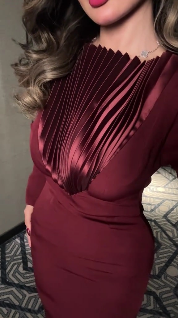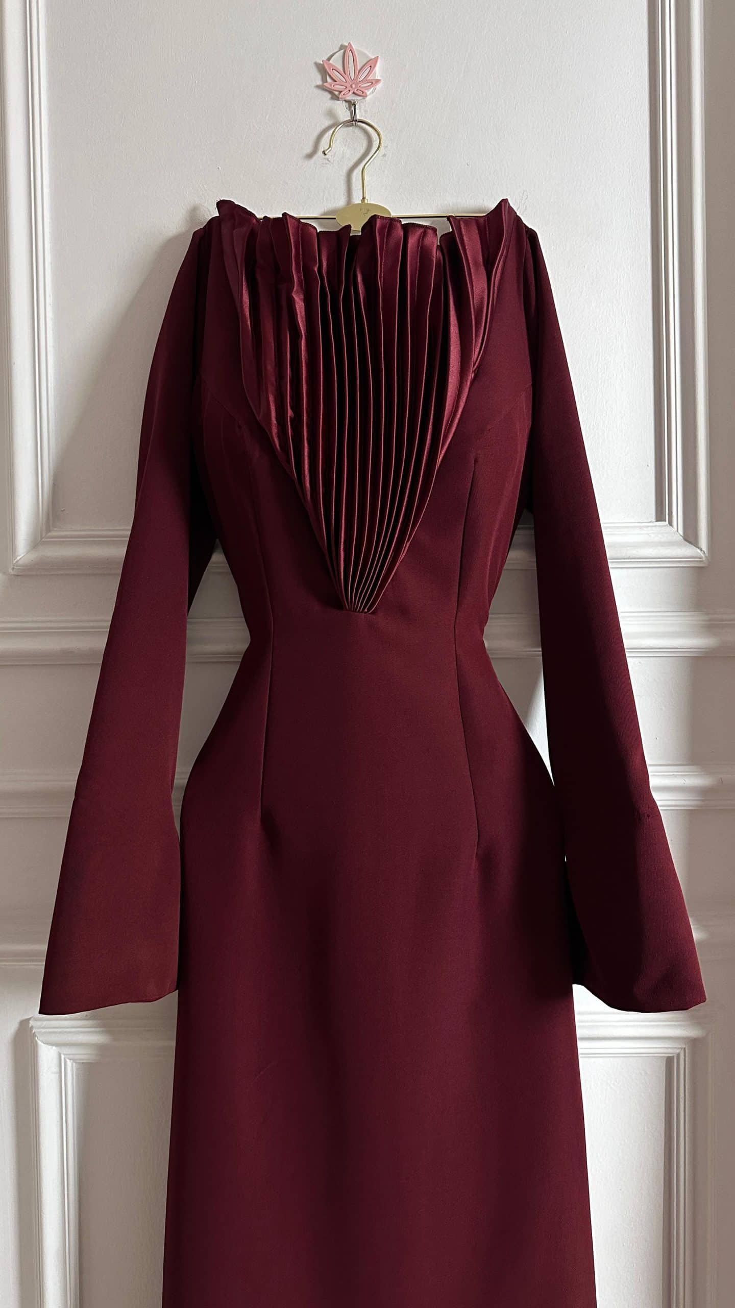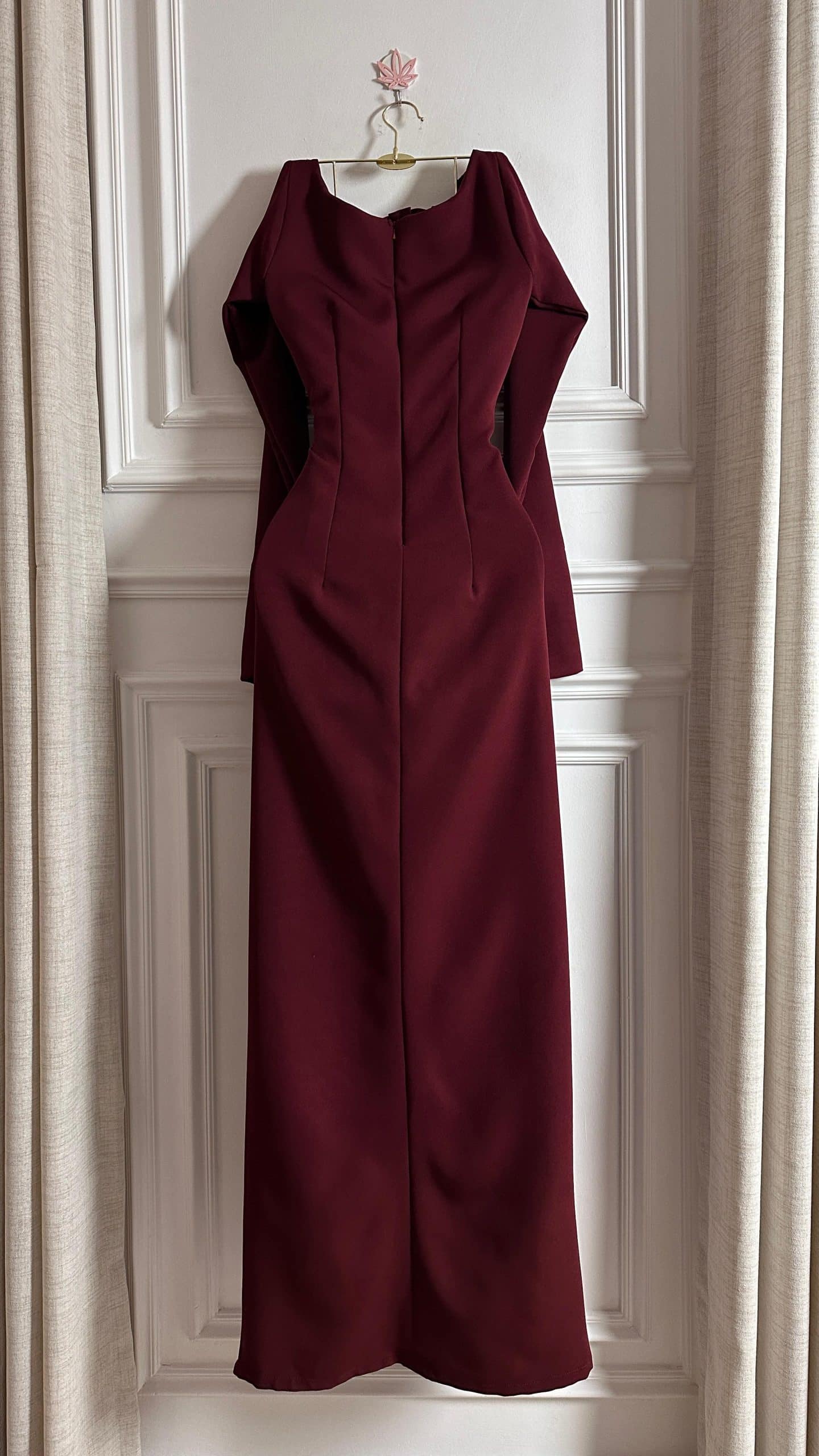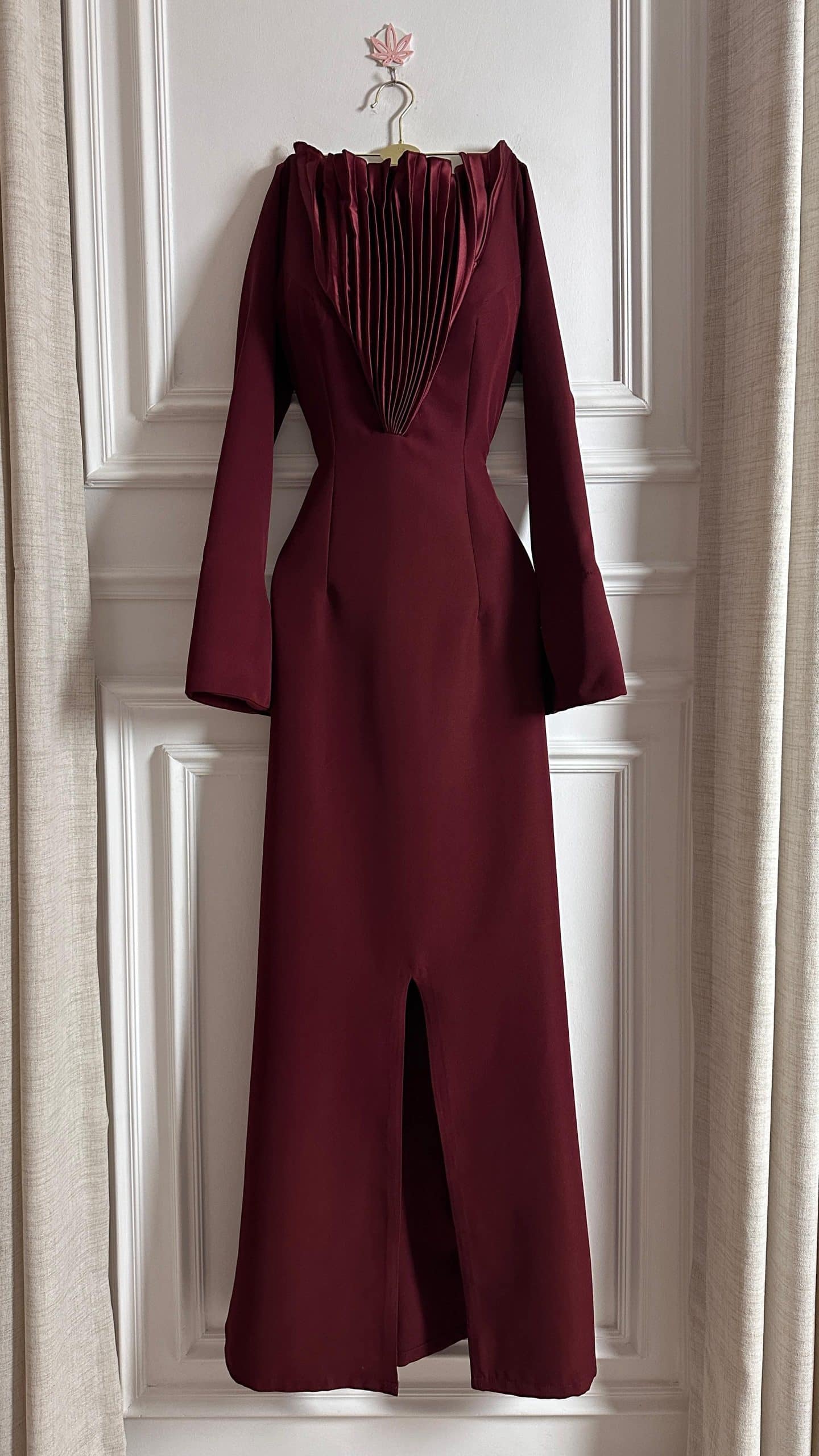 فستان سهرة بلون عنابي فاخر يعكس الأناقة الكلاسيكية بلمسة عصرية مميزة. يتميز بقصة انسيابية تبرز جمال القوام مع أكمام طويلة واسعة تضيف لمسة أنثوية راقية.