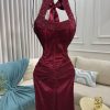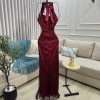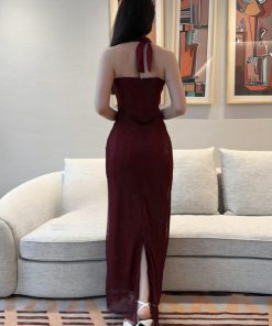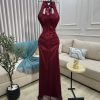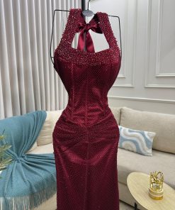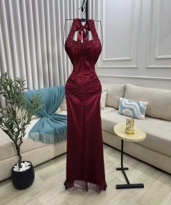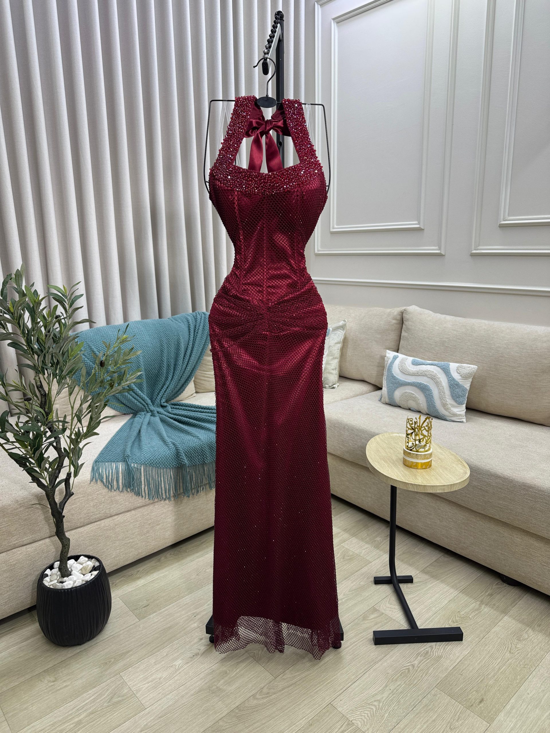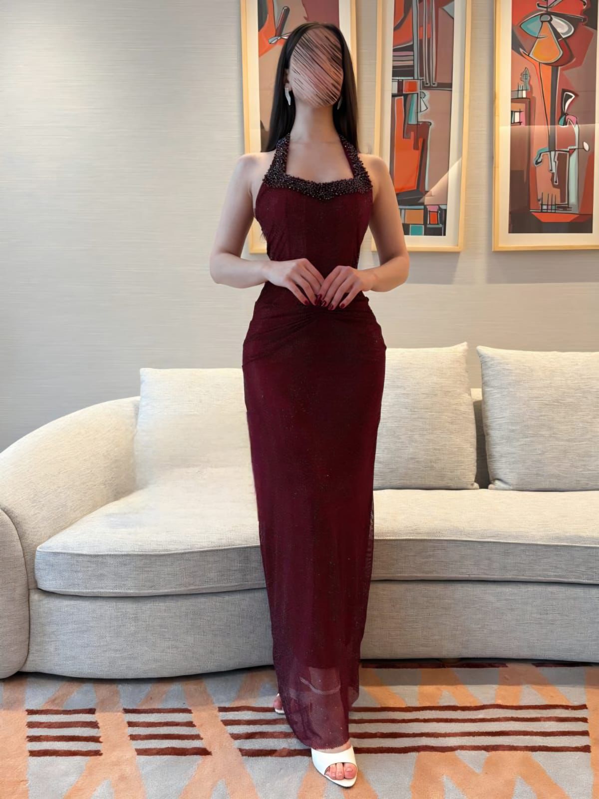 فستان سهرة عنابي بتصميم هالتر وتفاصيل فاخرة