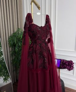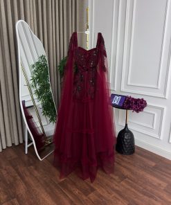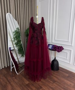 فستان سهرة عنابي بتول فاخر وتطريز أنيق تصميم ملكي بطبقات راقية