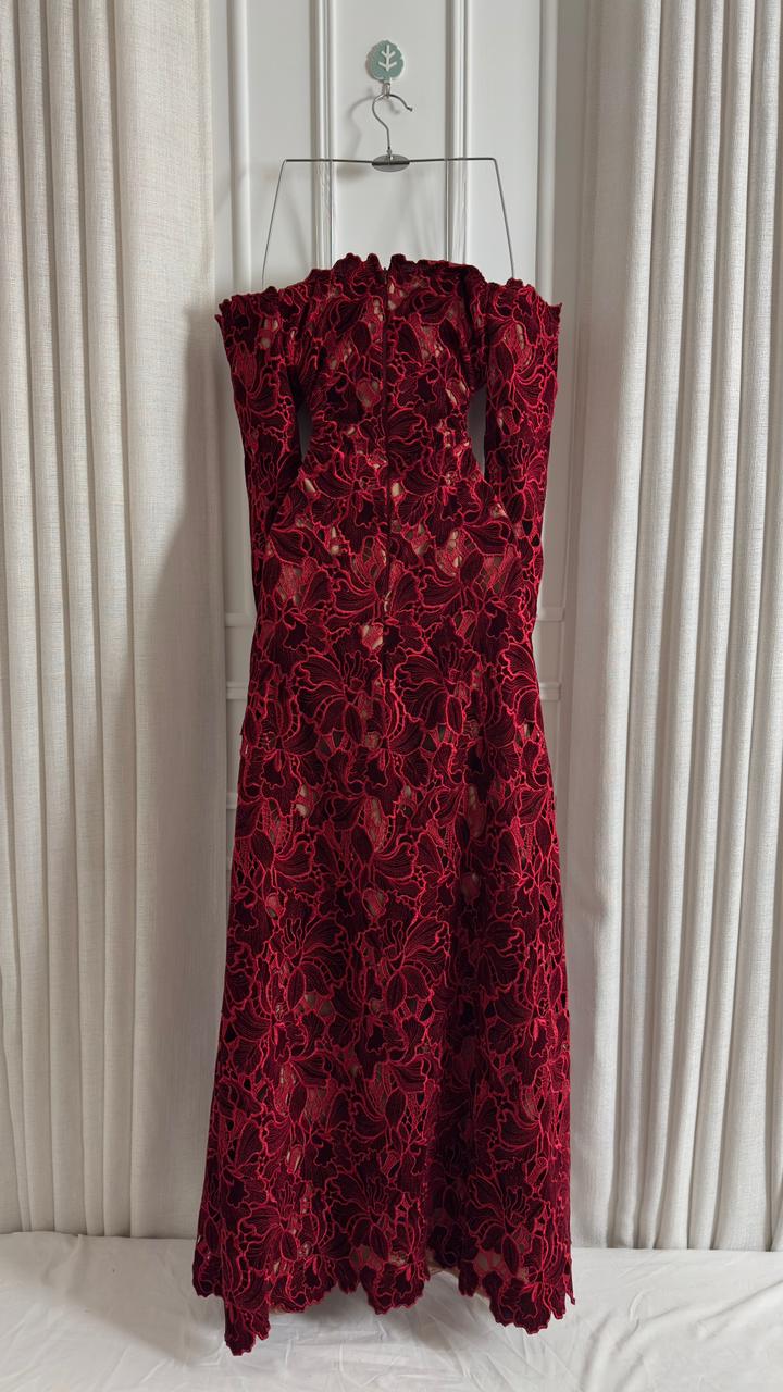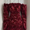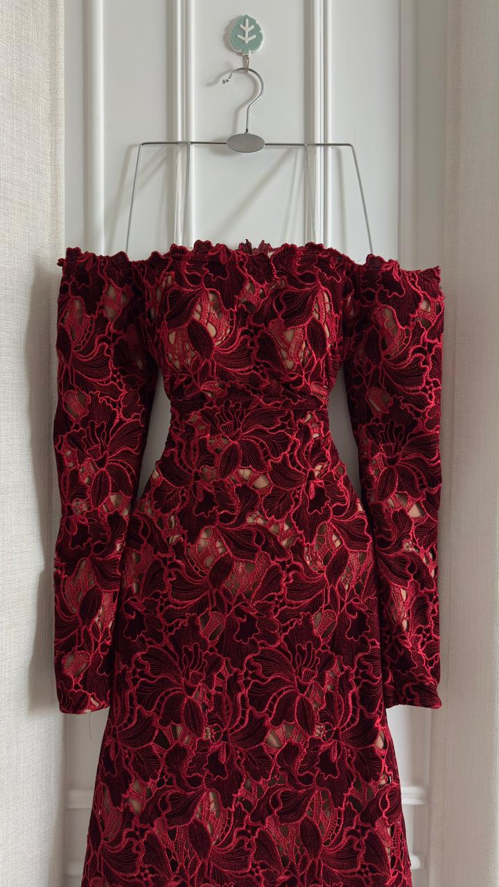 فستان سهرة عنابي دانتيل أوف شولدر… أناقة راقية وحضور أنثوي قوي | متجر روزيتا السعودي