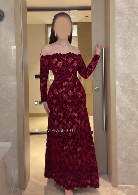 فستان سهرة عنابي دانتيل أوف شولدر بأكمام طويلة