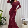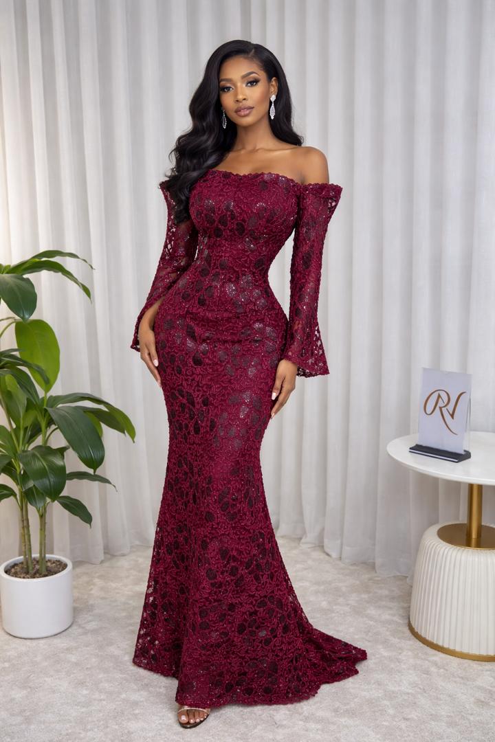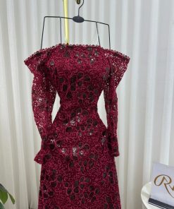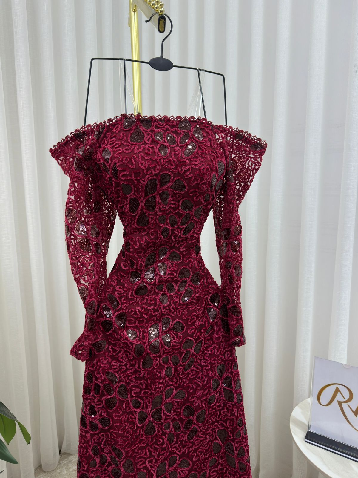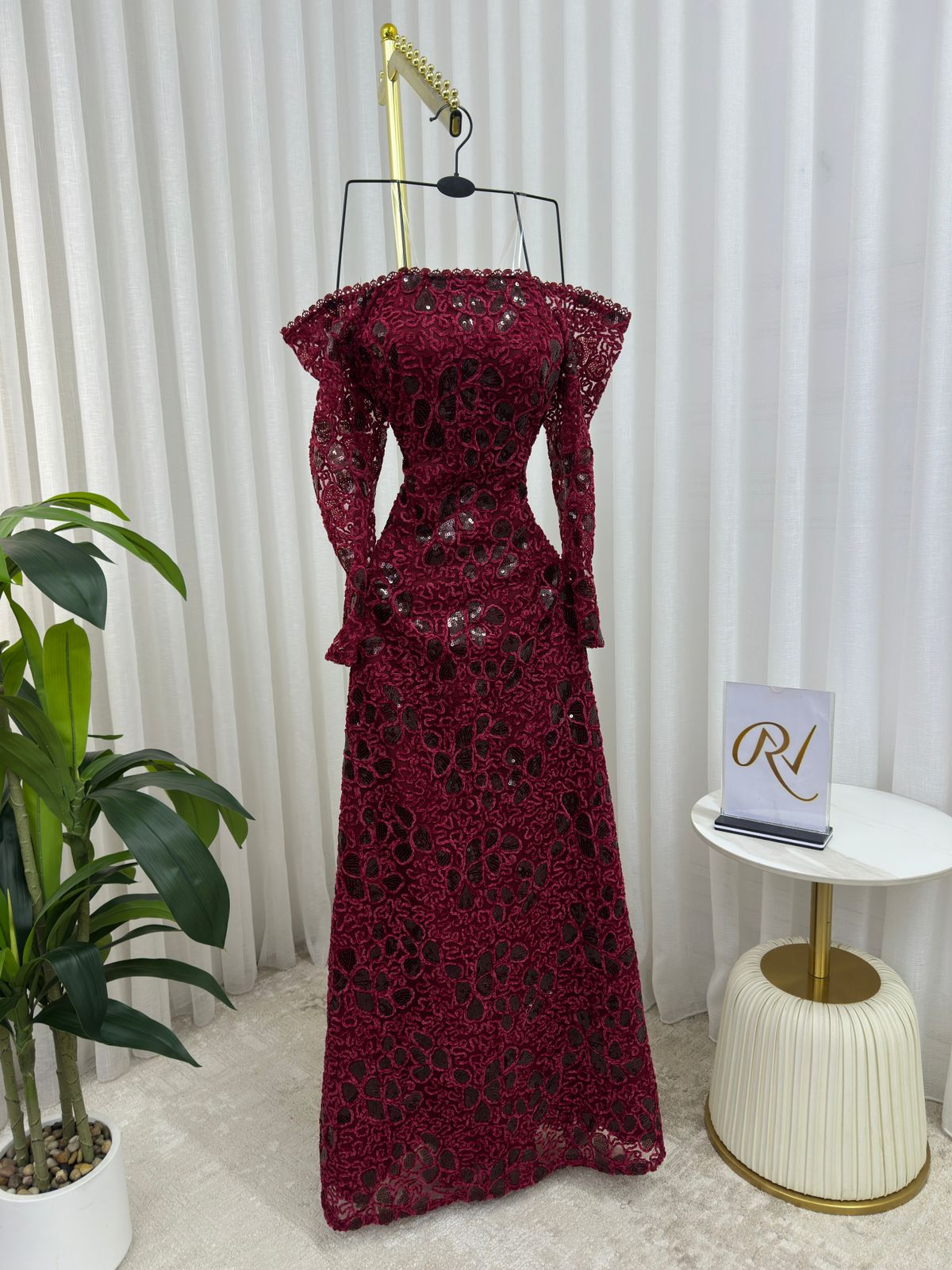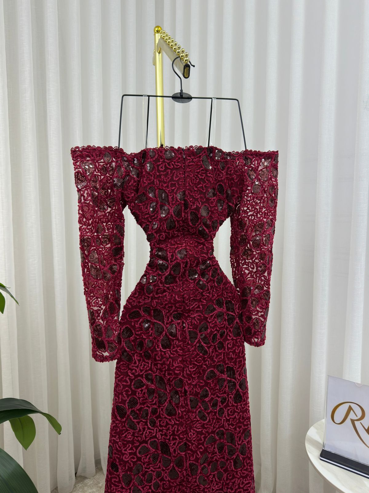 فستان سهرة عنابي دانتيل فاخر بأكمام طويلة