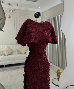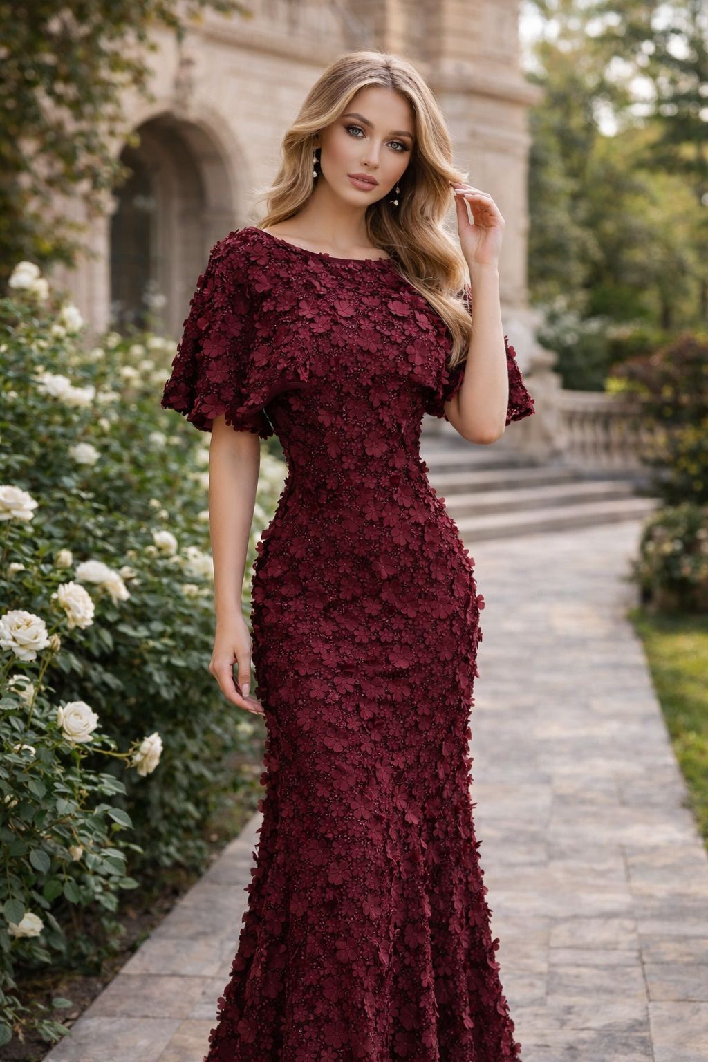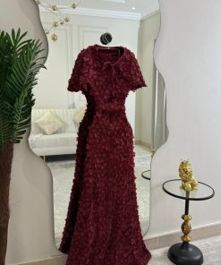فستان سهرة طويل باللون العنابي بتصميم فخم يبرز الأنوثة والرقي، مصنوع من قماش مطرّز بنقشة ورود بارزة تمنح الفستان مظهرًا راقيًا ولافتًا. يتميز بقصة ضيقة عند الخصر تبرز جمال القوام، مع أكمام قصيرة أنيقة تضيف لمسة ناعمة ومتوازنة للتصميم.