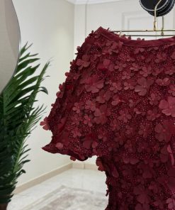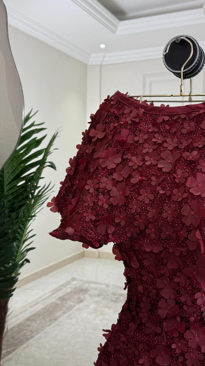 فستان سهرة عنابي طويل بتطريز وردي فاخر