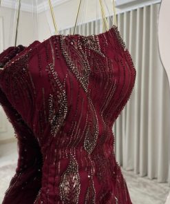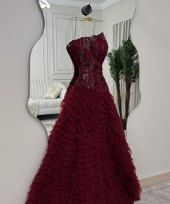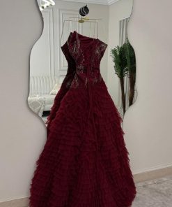 فستان سهرة عنابي فاخر بدون أكتاف بتصميم كشكش – منجر روزيتا السعودية