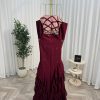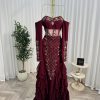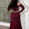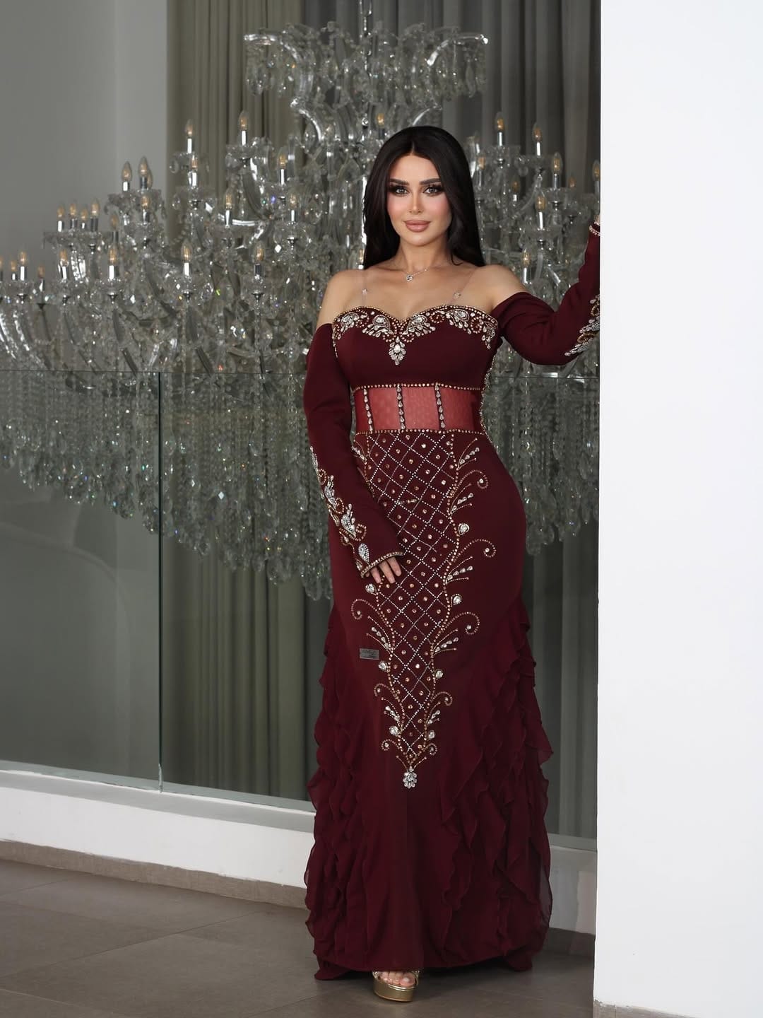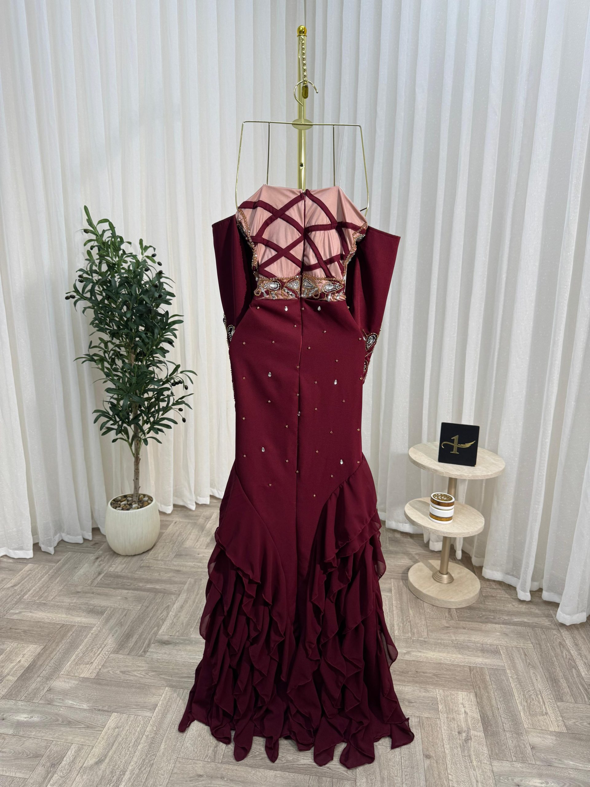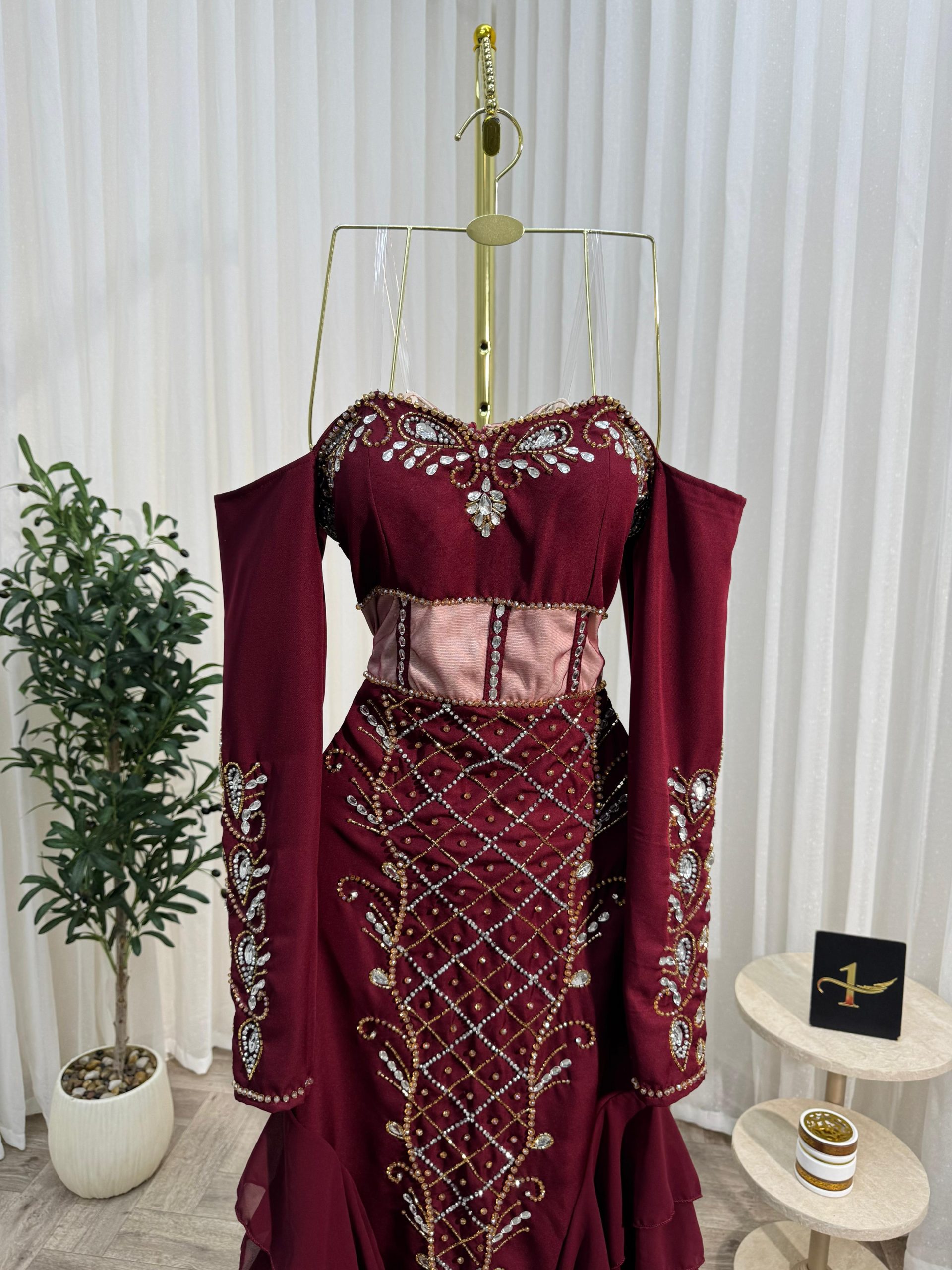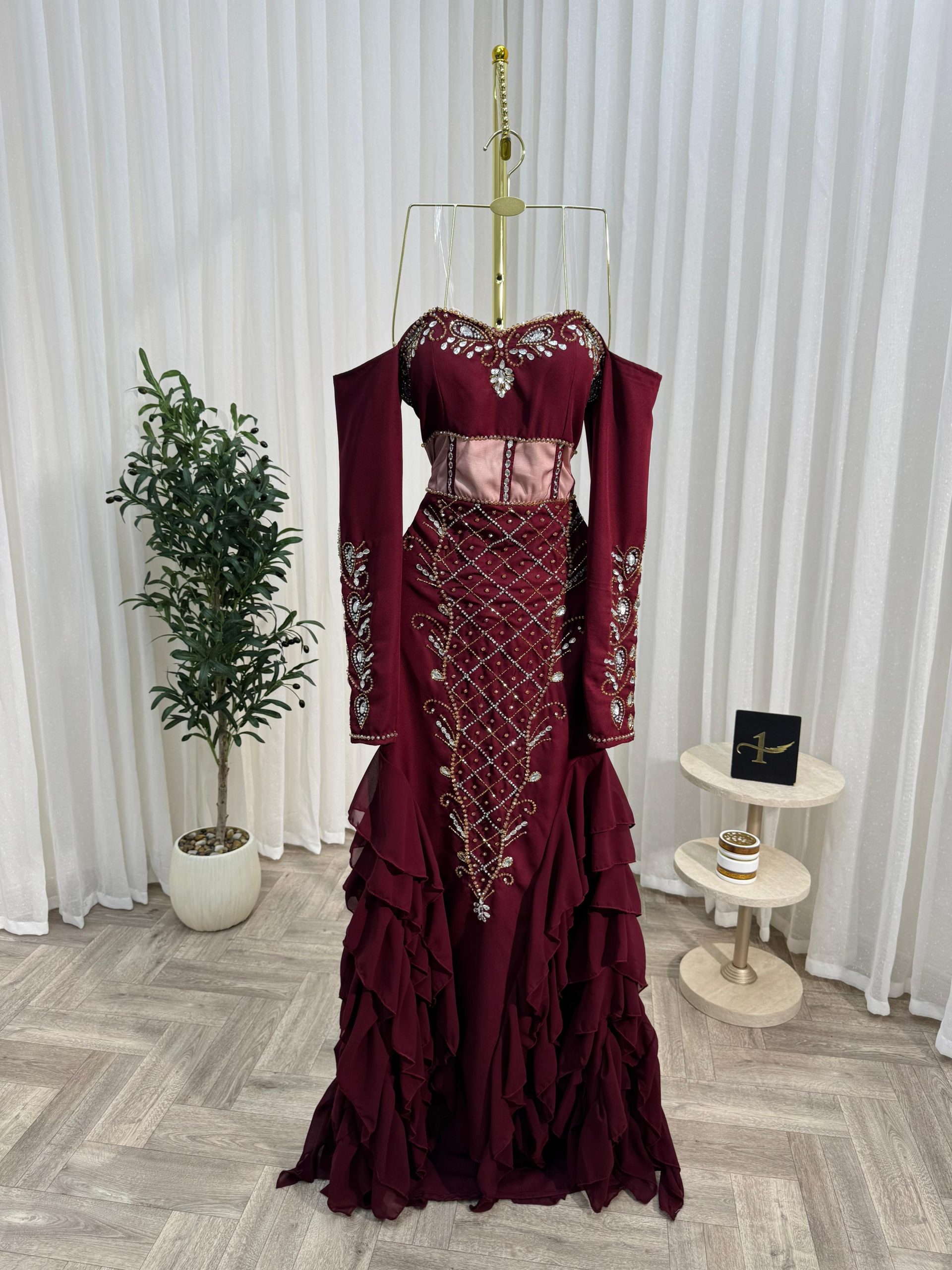 فستان سهرة عنابي مزخرف بالتطريزات اللامعة إطلالة ساحرة