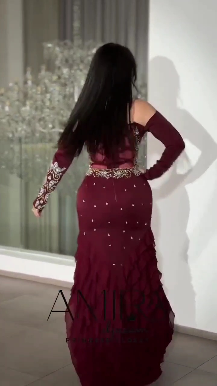 الفستان العنابي يتميز بتصميمه الأنيق والفخم، حيث يحتوي الجزء العلوي على تفاصيل مشدودة مع أكمام طويلة مزخرفة بالتطريزات اللامعة. تنسيق الألوان بين الفستان والمكملات في الجزء السفلي يبرز الجمال بشكل رائع، حيث يتناغم الجزء السفلي المزين بالطبقات المتعددة من القماش مع التطريزات البراقة، مما يضيف لمسة من الفخامة والجاذبية.