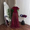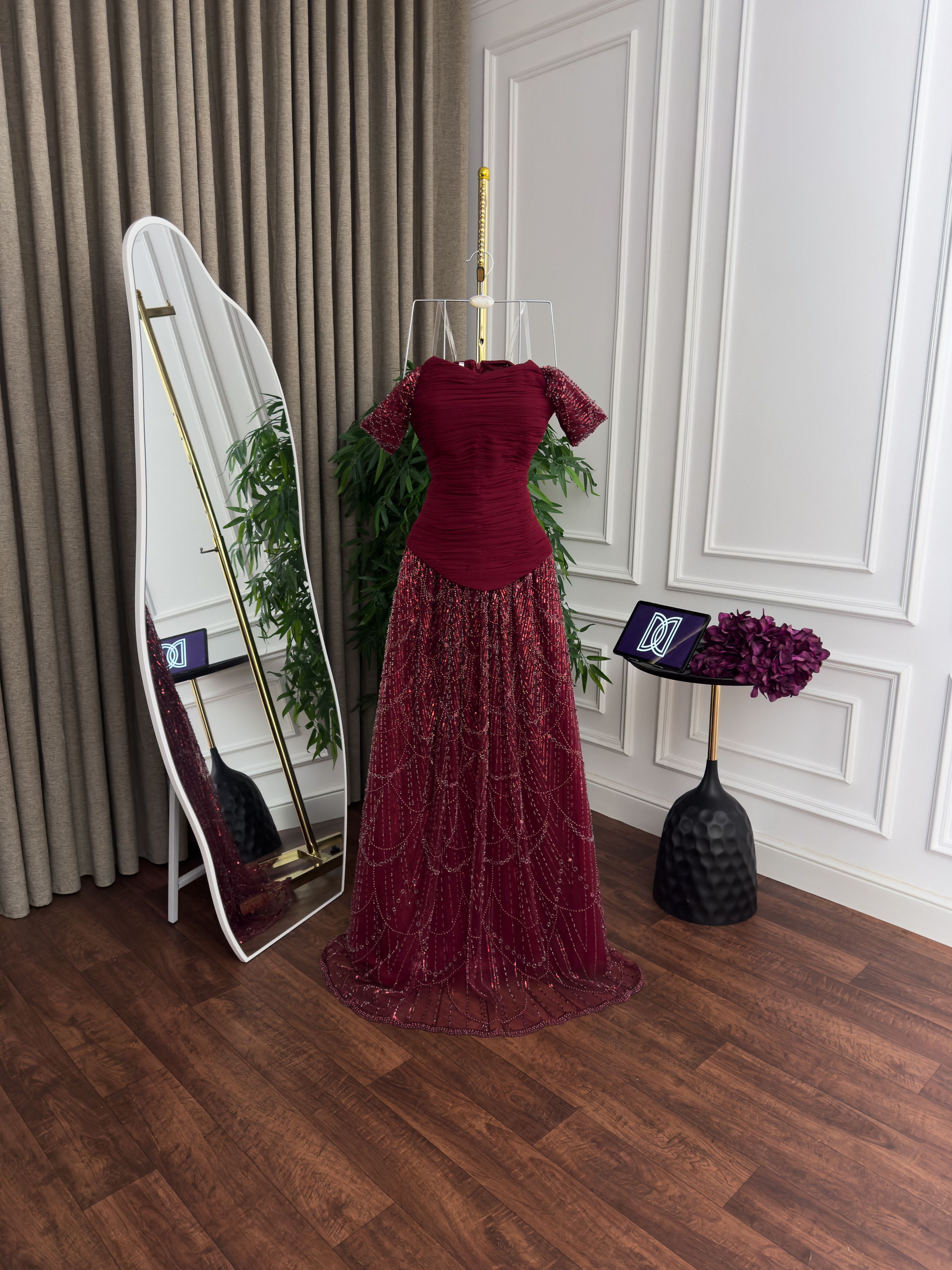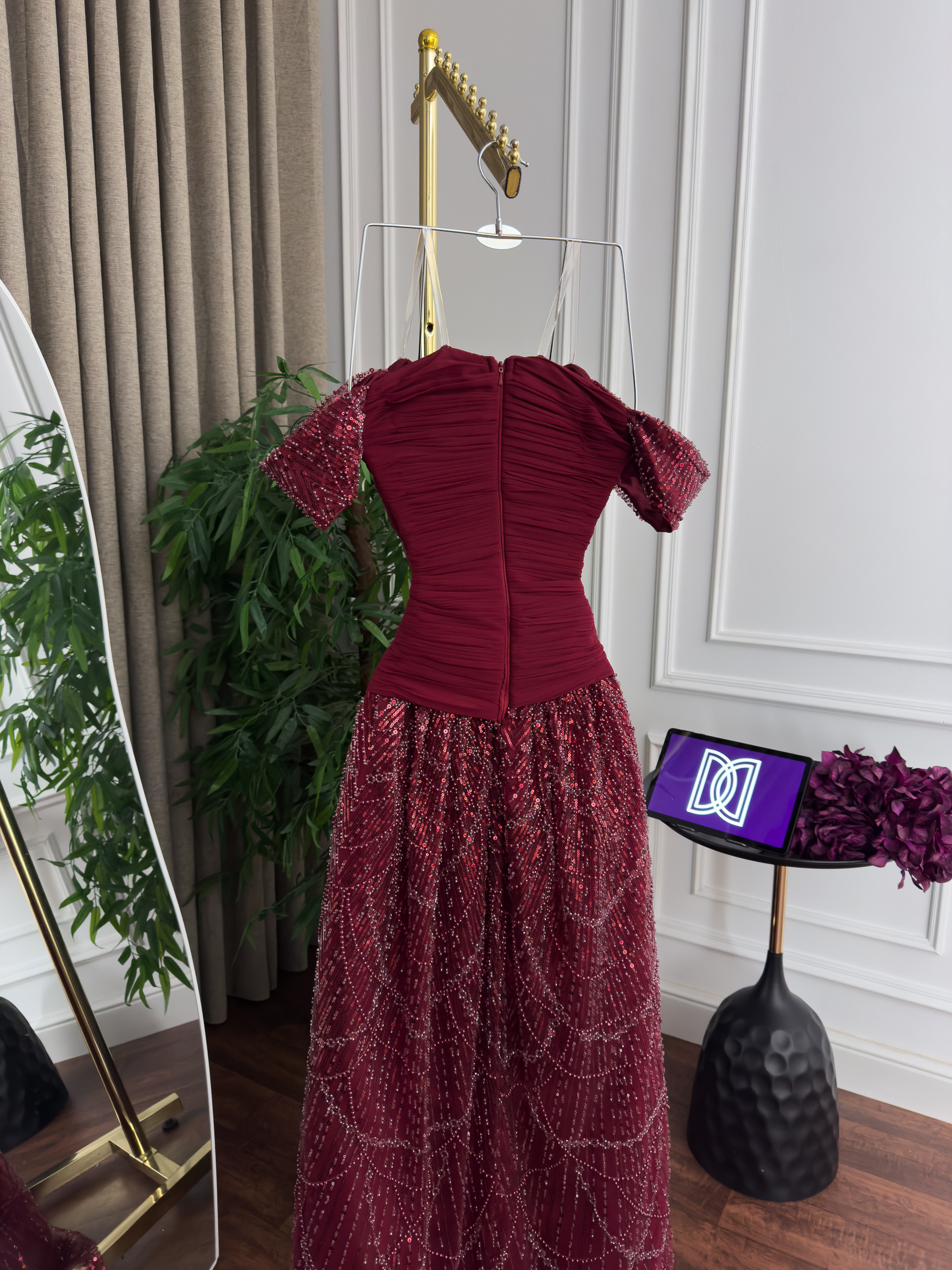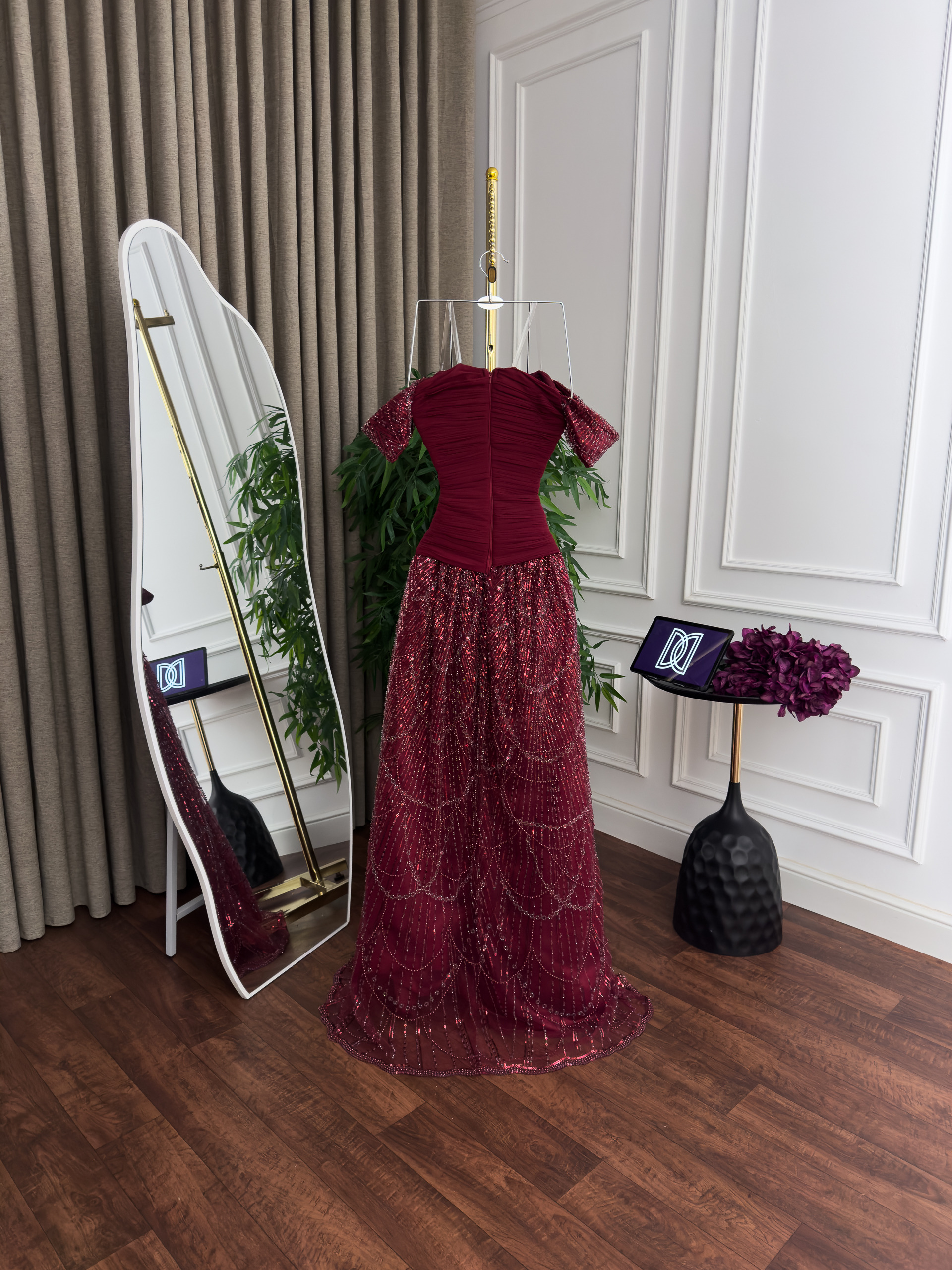 فستان سهرة عنابي مزخرف بالتطريزات اللامعة