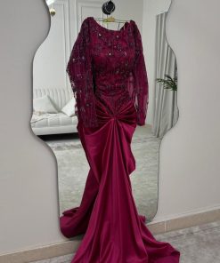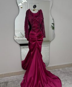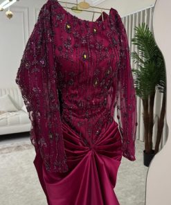 فستان سهرة عنابي مزين بتطريزات لؤلؤية