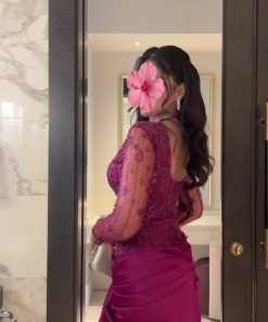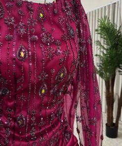 الفستان يأتي بلون عنابي فاخر يعكس الأناقة والفخامة، مما يجعله مثاليًا للمناسبات الخاصة مثل حفلات الزفاف، السهرات الفاخرة، أو المناسبات الرسمية. الجزء العلوي مزين بتطريزات لؤلؤية لامعة تضيف لمسة من التألق والجمال، بينما ينساب الفستان إلى الأسفل بتصميم طويل يجسد الفخامة والأناقة.