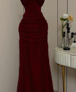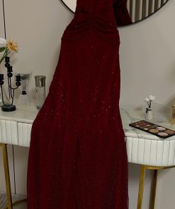 فستان سهرة عنابي مطرز بفتحة جانبية أنيقة