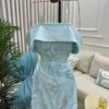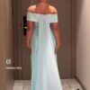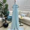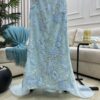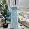 فستان أنيق باللون الأزرق سماوي، مصمم الدانتيل راقٍ وفخم. تتميز بقماش شفاف مطرّز بنسيج دقيق بخيوط لامعة، ما يضفي عليه لمسة نهائية. الجزء من القماش الناعم الممتلئ انسيابية وأناقة.