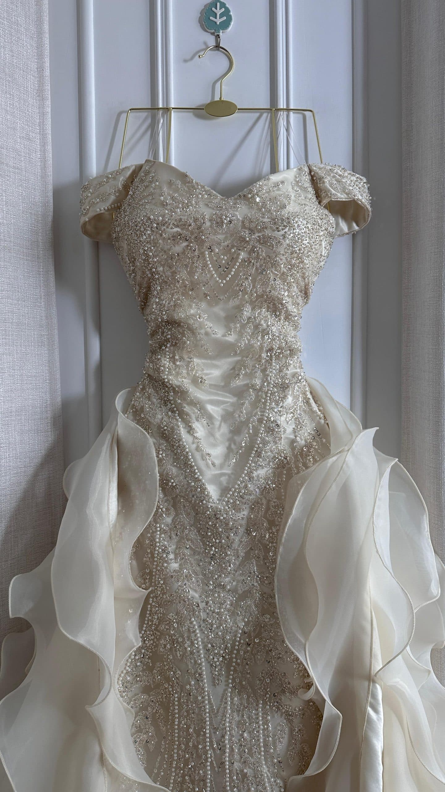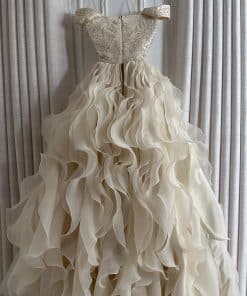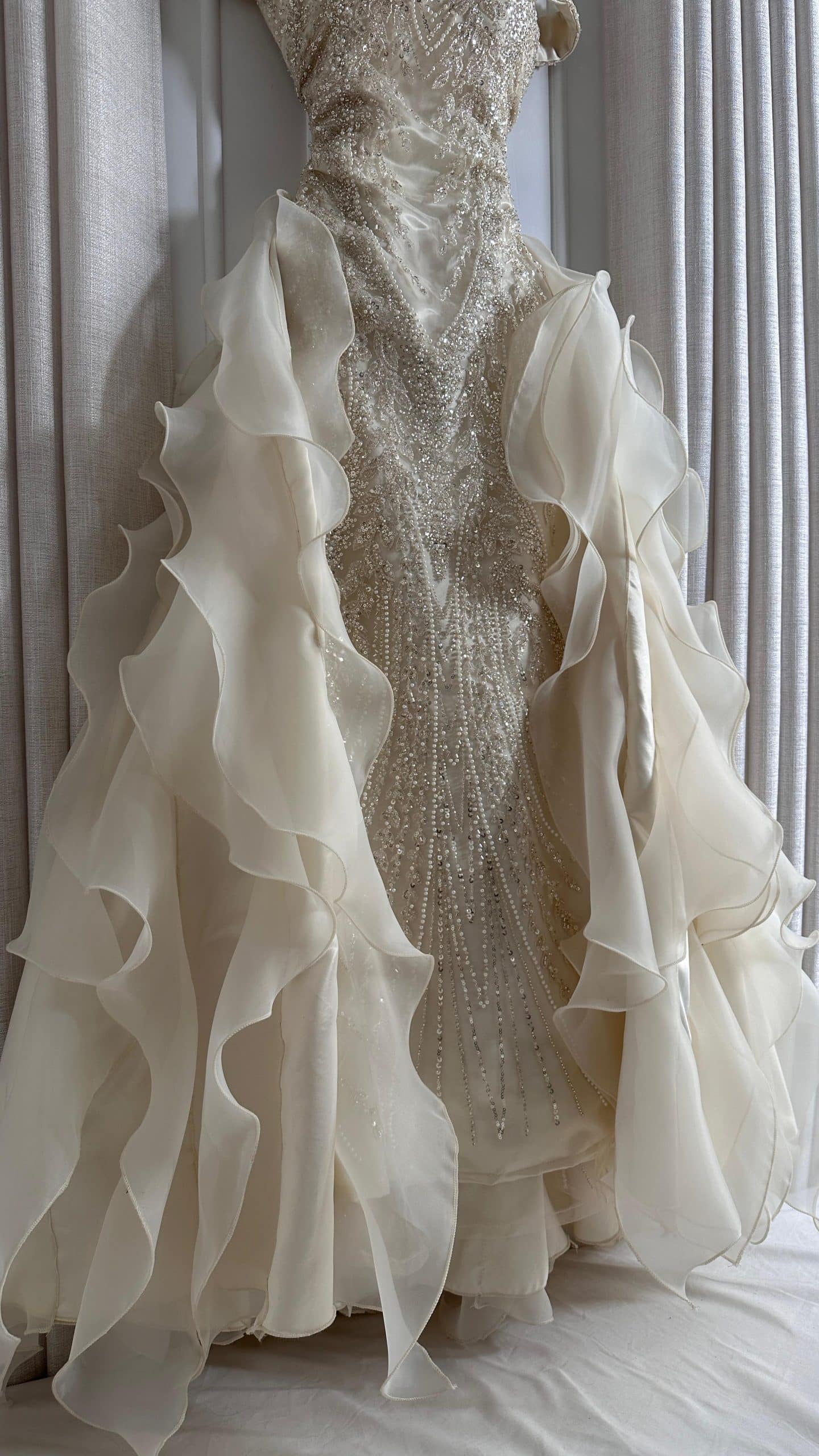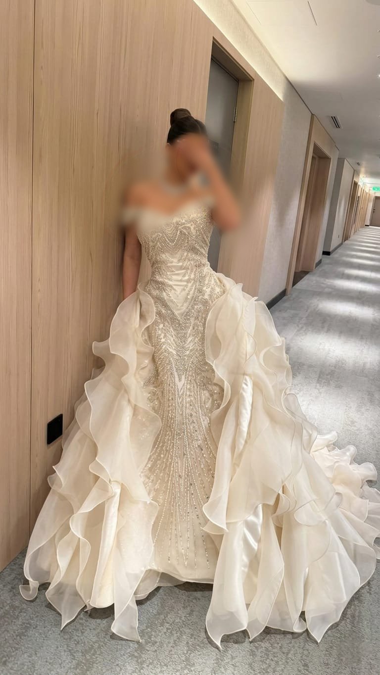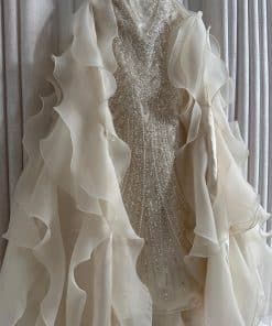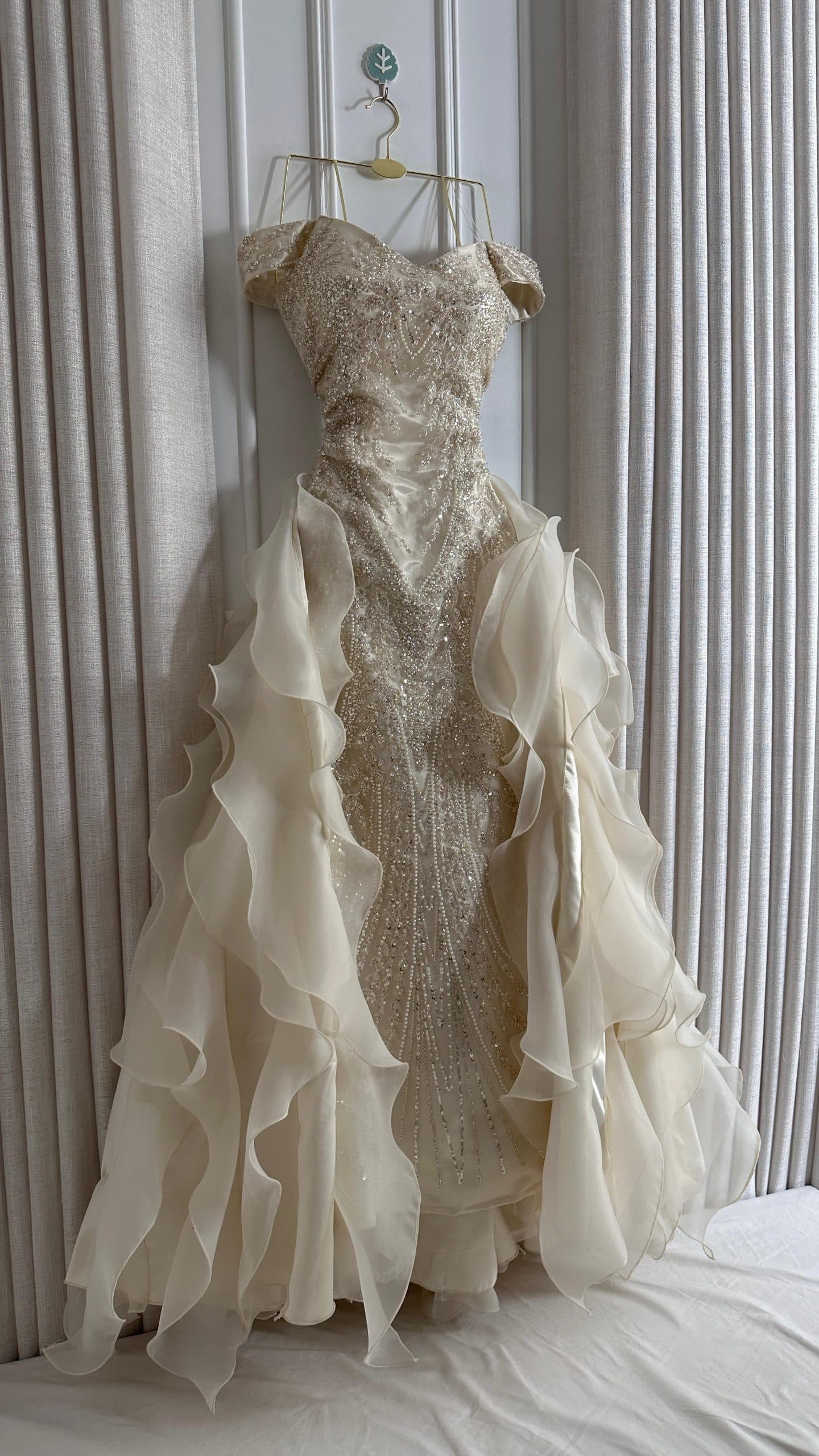 يأتي الفستان بذيل واسع من طبقات الأورجنزا الناعمة التي تمنحك حركة انسيابية وإطلالة أميرية فخمة، ليكون اختيارك المثالي