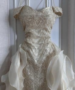 فستان سهرة أوف وايت فاخر يجسد الأناقة الملكية والرقي، مصمم ليمنحك إطلالة ساحرة في جميع المناسبات داخل السعودية. يتميز بقصة أوف شولدر أنثوية تبرز جمال الأكتاف، مع تطريزات لامعة دقيقة تضيف لمسة فخامة جذابة.