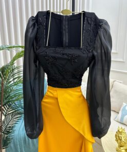 توب أسود مطرز بتفاصيل لامعة ونقوش نباتية فخمة، مع ياقة مربعة وأكمام مطرزة تضفي لمسة أنثوية جذابة.