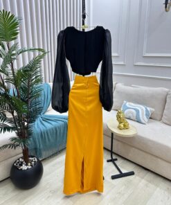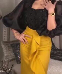 إذا كنت تبحث عن إطلالة على ملفتة للأنظار تتواصل بين الفاكهه الخامسة، فإن هذا البعد سيكون خيارك المثالي. تتميز تختلف ملابسها الراقي الذي يجمع بين توب أسود وأكمام طويلة، وتنورة ساتان أصفر الجريء مع كشكشة إضافية وحركة وانسيابية فريدة.