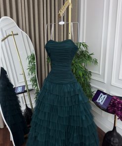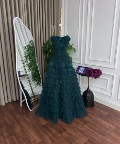 فستان سهرة فاخر بتصميم أنيق ولون أخضر بترولي عميق، يتميز بقصّة كورسيه محكمة تبرز جمال القوام وتمنح إطلالة راقية. الجزء العلوي مصنوع بتفصيلات درابية ناعمة تضيف لمسة أنثوية، مع تنورة واسعة متعددة الطبقات من التول الخفيف تمنح الفستان حركة وانسيابية جذابة. اختيار مثالي للمناسبات الرسمية والسهرات الفاخرة.