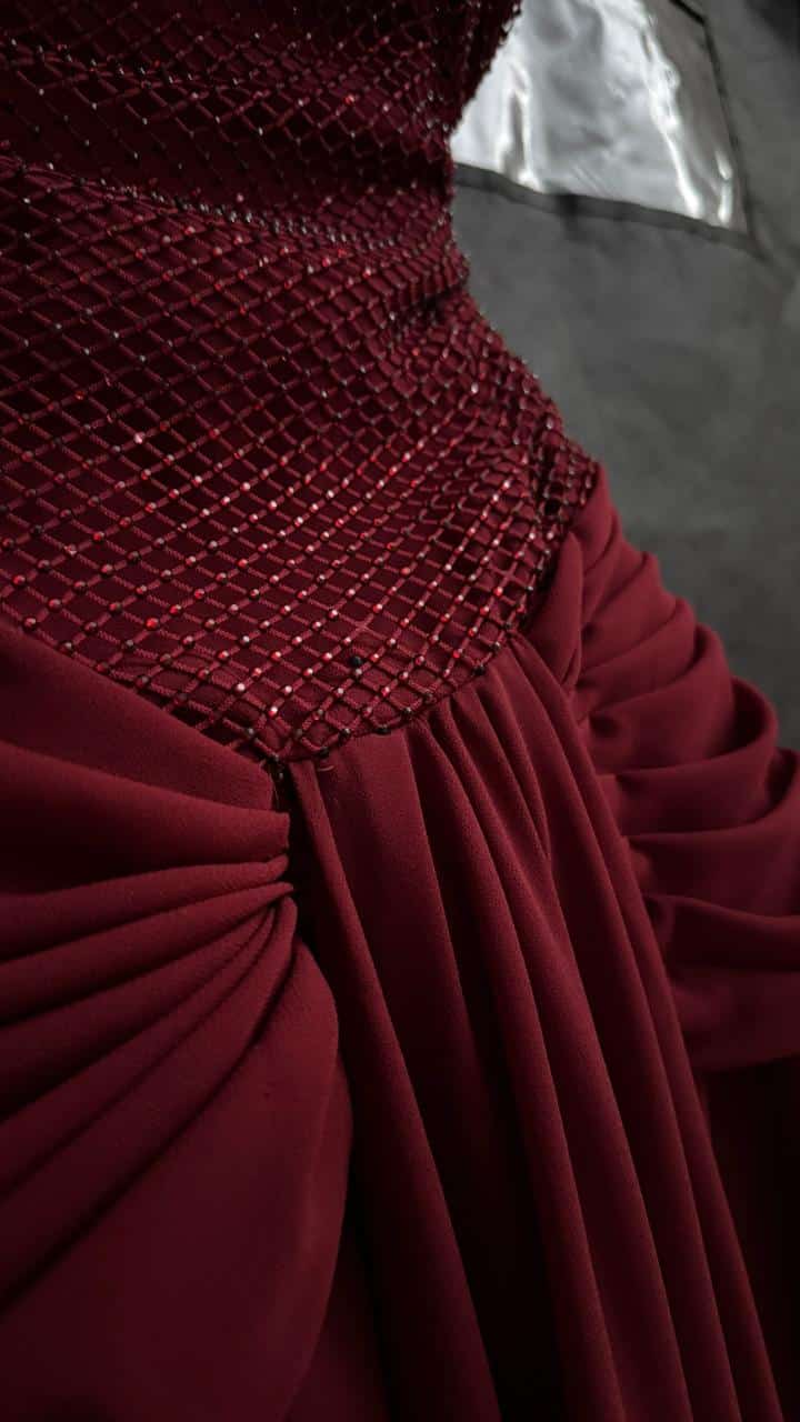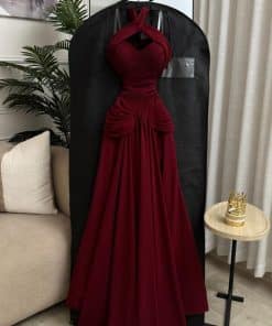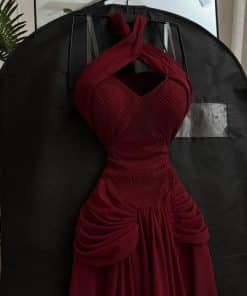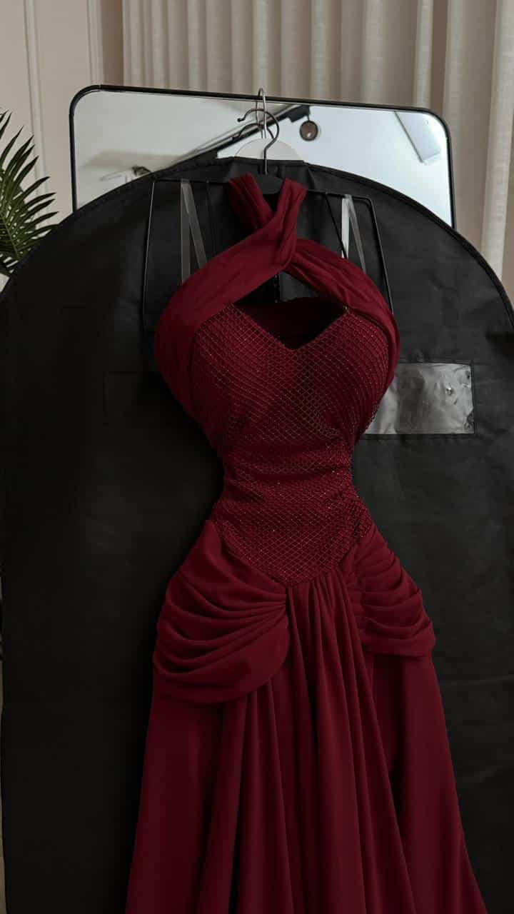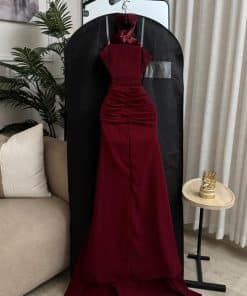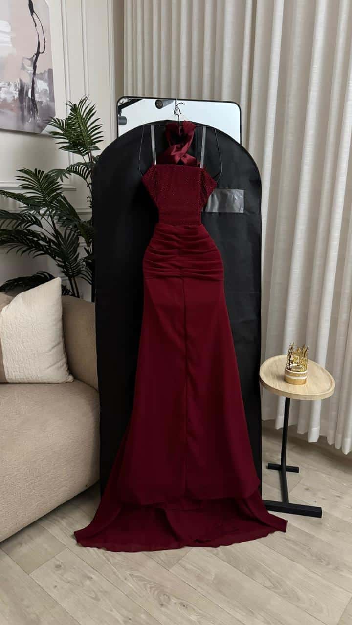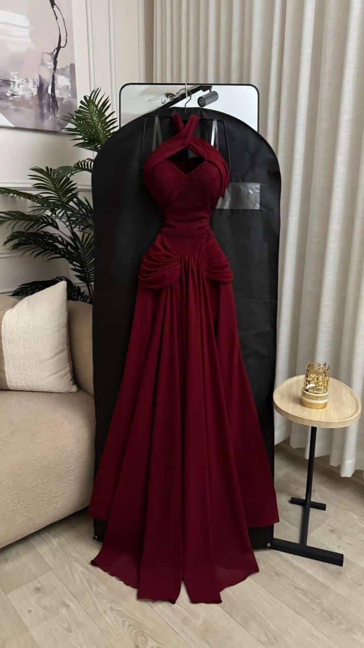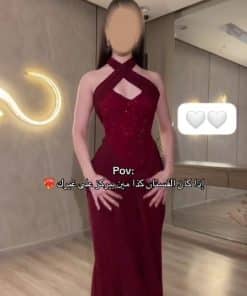 تألقي بإطلالة ساحرة مع هذا الفستان الخمري الفاخر المصمم ليمنحك حضورًا ملكيًا في جميع المناسبات. يتميز الفستان بتصميم رقبة هالتر الأنيق الذي يبرز الكتفين بشكل جذاب، مع قصة ضيقة من الأعلى وتفاصيل كشكشة راقية تضيف لمسة فخامة.