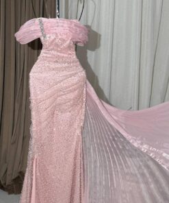 فستان سهرة فاخر بلون وردي ناعم: تألقي بإطلالة ملكية