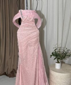 إذا كنتِ تبحثين عن فستان يجمع بين الرقي والفخامة في آنٍ واحد، فهذا التصميم الوردي الساحر هو الخيار المثالي لكِ. يتميز الفستان بقصة ضيقة تبرز جمال القوام، وهو مصنوع من قماش لامع مرصع بالخرز والترتر الذي يعكس الإضاءة بطريقة أنيقة.
