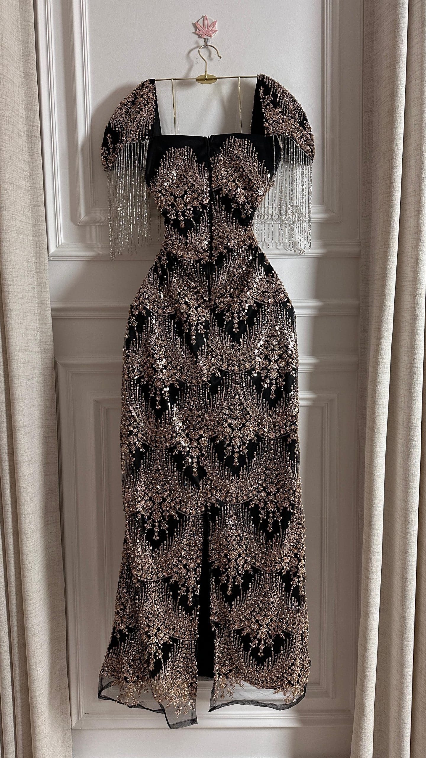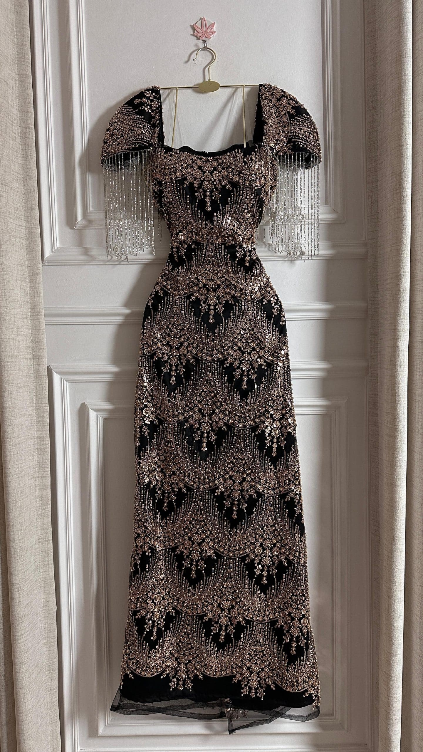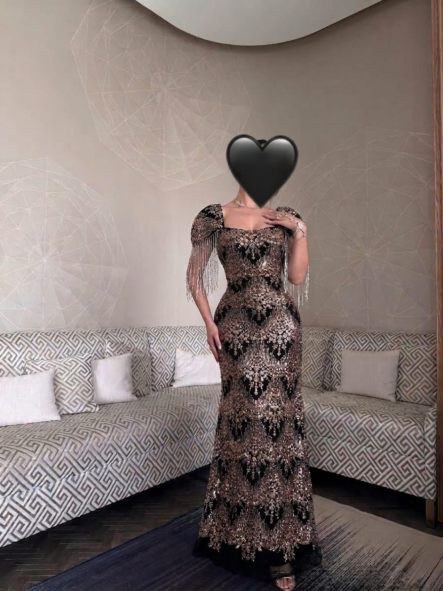فستان سهرة فاخر مطرز بالترتر الذهبي مع أكمام مزينة بالشراشيب
