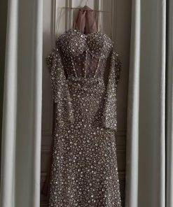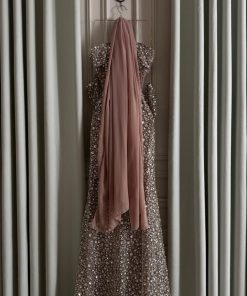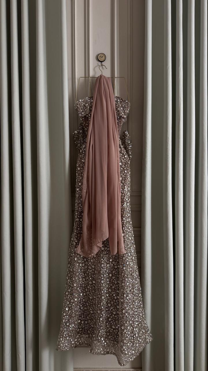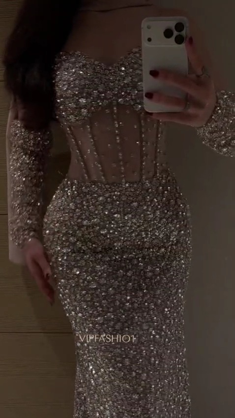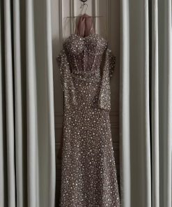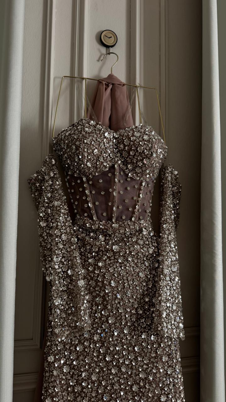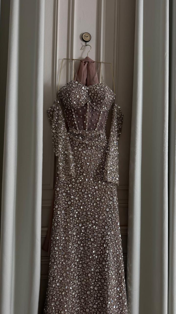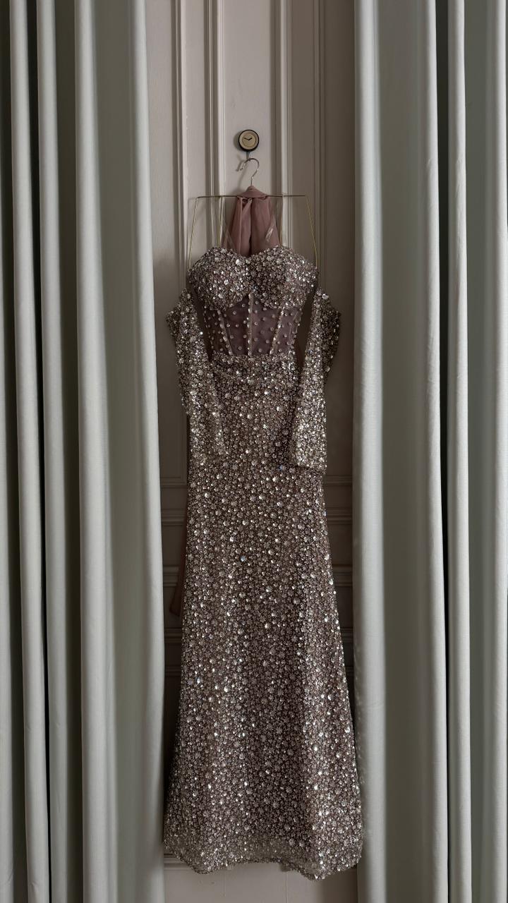 فستان سهرة فخم وناعم مرصّع بالكامل بالترتر اللامع، بتصميم أنثوي أنيق وقصّة تبرز القوام بشكل راقي. خيار مثالي للحفلات والمناسبات الخاصة لإطلالة تخطف الأنظار.