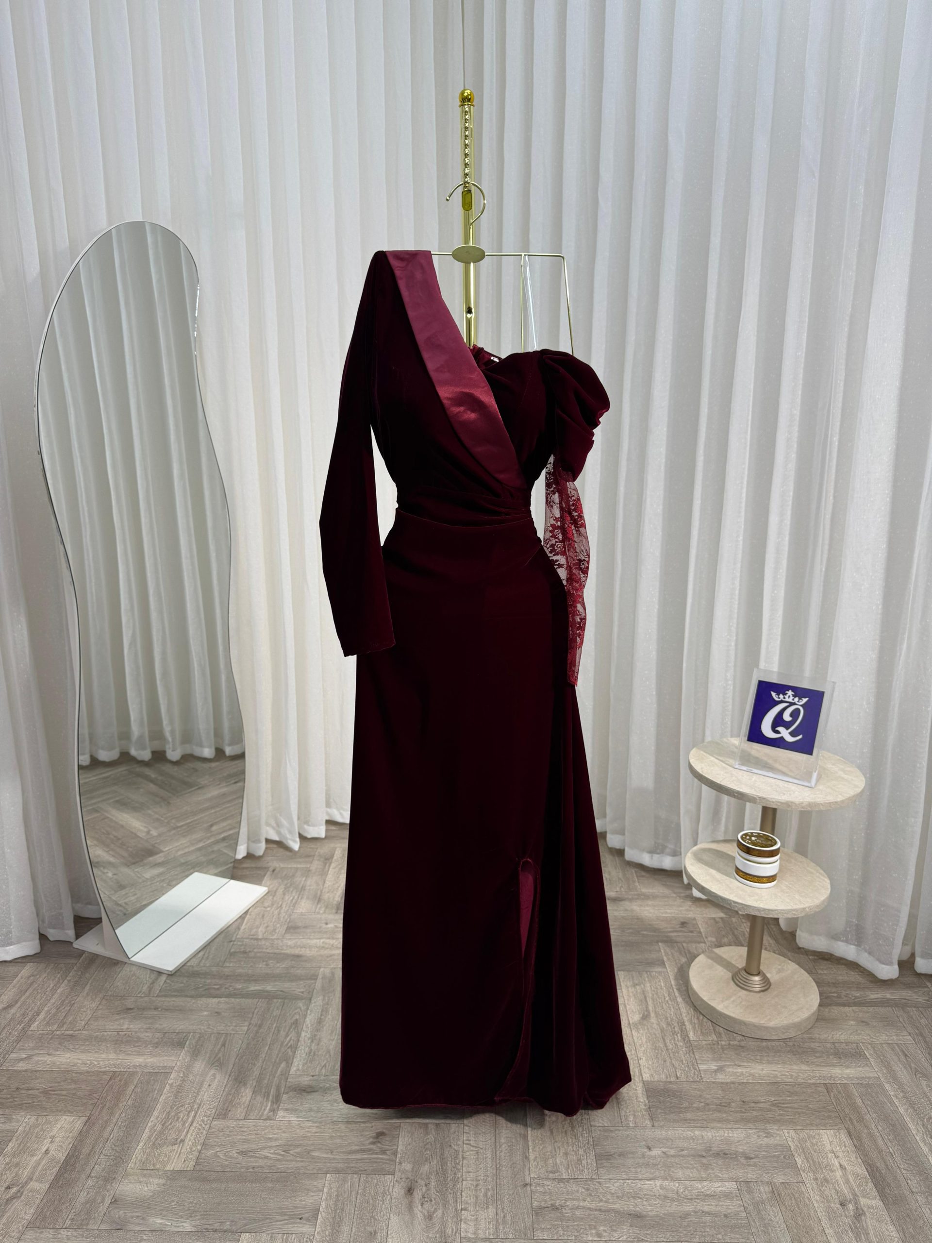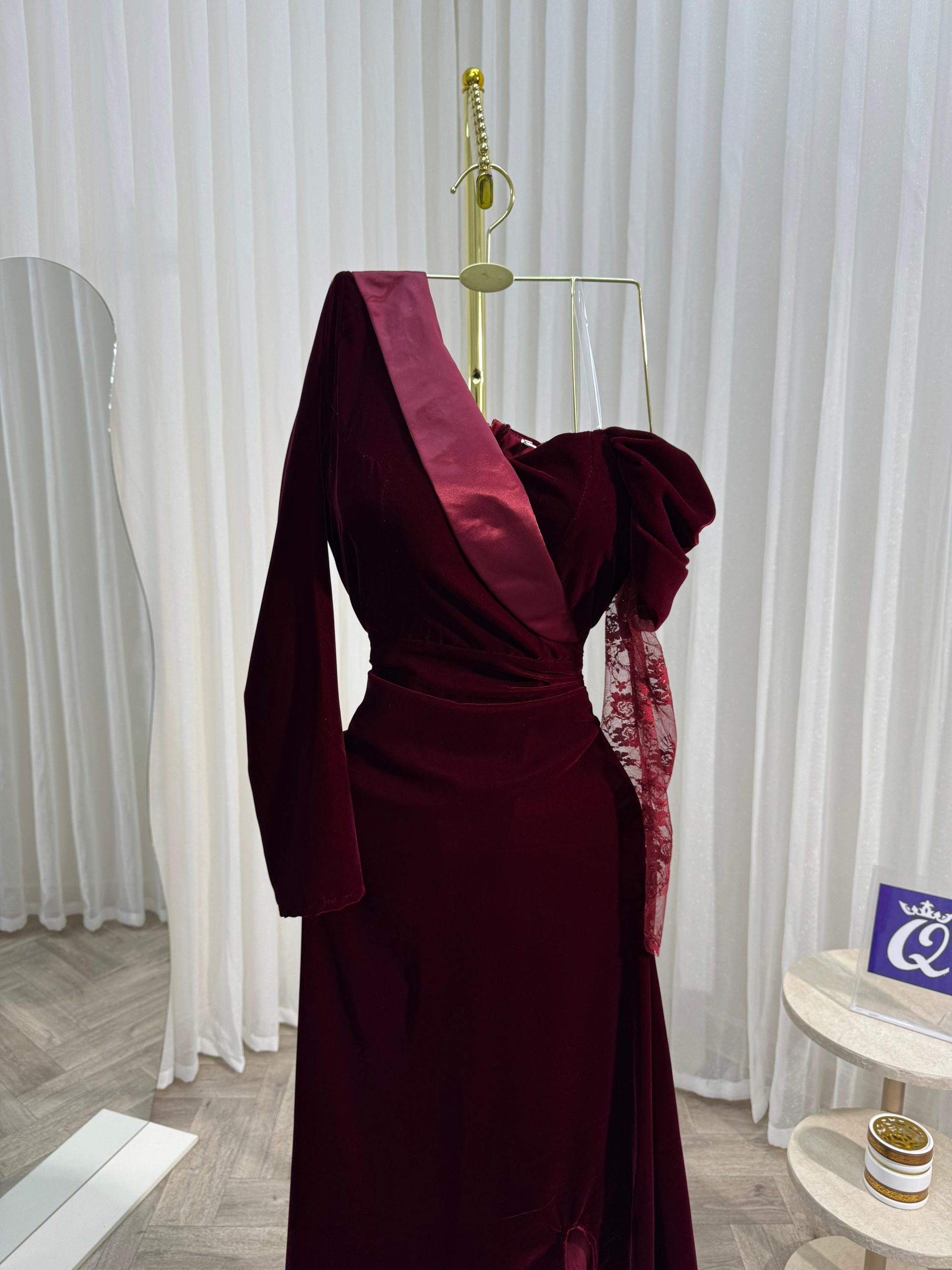 فستان سهرة قطيفه بتصميم كتف واحد ولمسة دانتيل أنيقة من متجر روزيتا السعودي