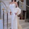 اللمسة الأجمل في التصميم تكمن في جوانب الفستان المزينة بالدانتيل المطرّز بعناية، ما يضيف بعدًا فاخرًا وحيوية أنيقة عند الحركة، ويمنح الفستان طابعًا مميزًا يلفت الأنظار.