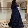 فستان سهرة كحلي بتصميم راقٍ ولمسات دانتيل فاخرة