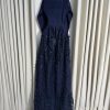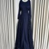 فستان سهرة كحلي بتفاصيل دانتيل فاخرة وتصميم أنيق
