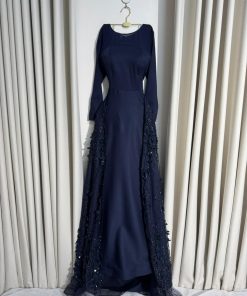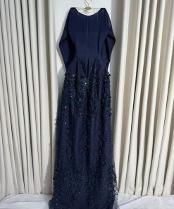 فستان سهرة كحلي بتفاصيل دانتيل فاخرة وتصميم أنيق – متجر روزيتا السعودي