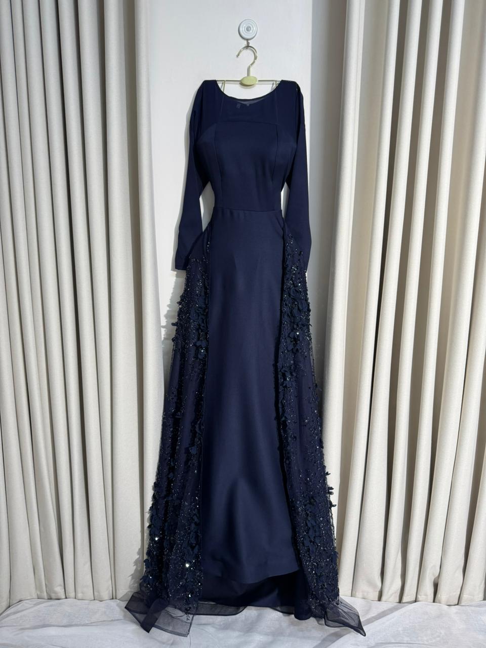 يأتي هذا الفستان الكحلي ليعكس مفهوم الأناقة الهادئة والفخامة الراقية، حيث يجمع بين التصميم الكلاسيكي والتفاصيل العصرية التي تبرز جمال الإطلالة دون مبالغة. خيار مثالي للسيدة التي تبحث عن الرقي والتميز في مناسباتها الخاصة.