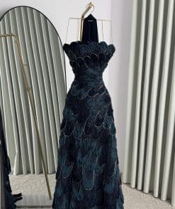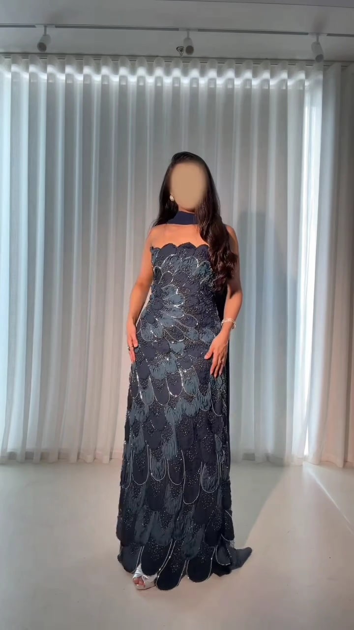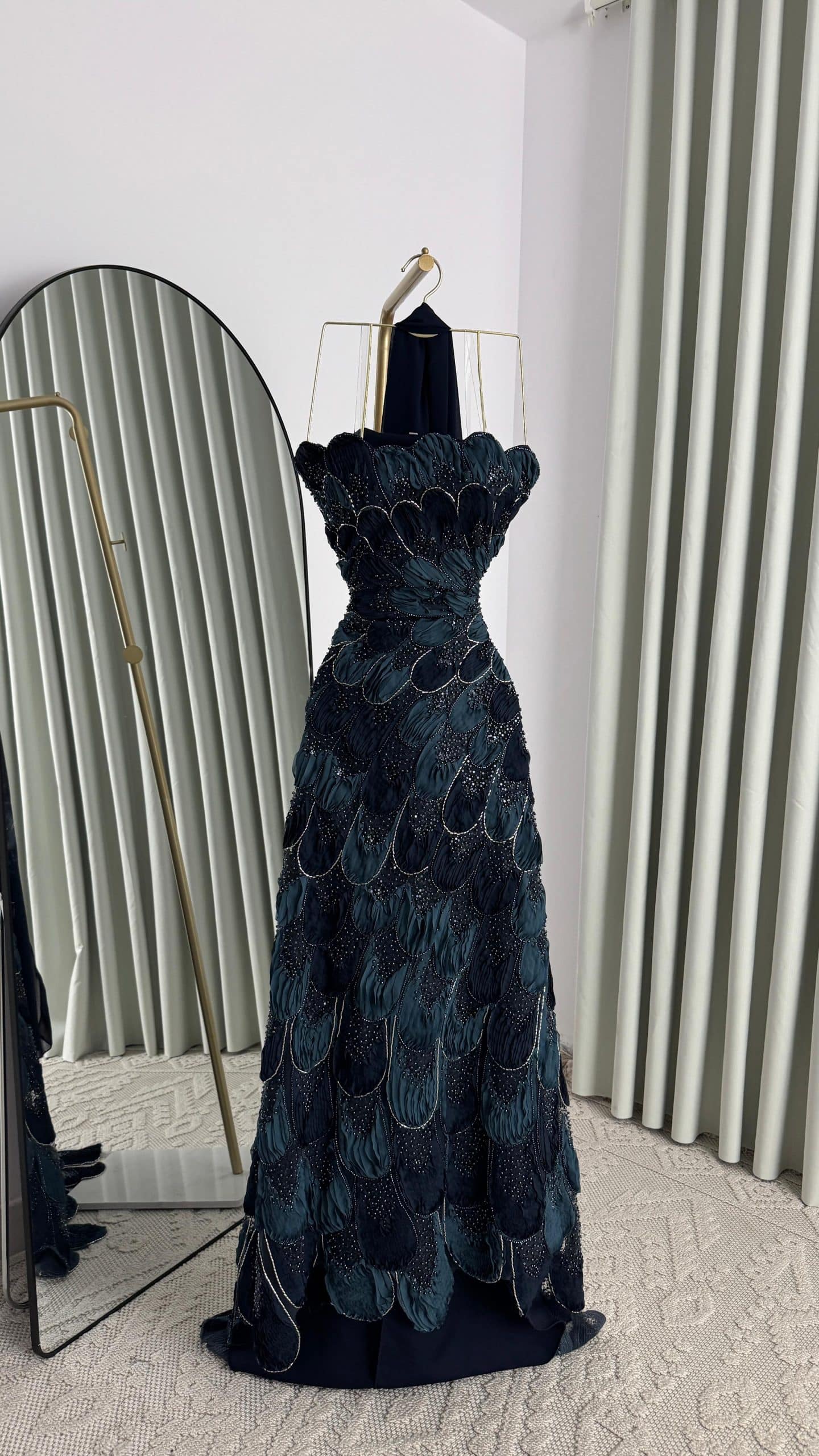 تألقي بإطلالة فاخرة ومميزة مع هذا الفستان الكحلي الراقي المصمم بتطريزات ورقية بارزة تمنحه حضورًا أنيقًا في السهرات والمناسبات الخاصة. يتميز الفستان بقصة طويلة ناعمة تبرز القوام بأسلوب أنثوي راقٍ، مع تصميم علوي فاخر وتفاصيل لامعة تضيف بريقًا هادئًا تحت الإضاءة.
