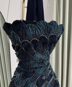 فستان سهرة كحلي فاخر بتطريز ورقي بارز وتصميم طويل