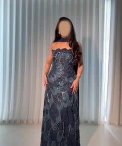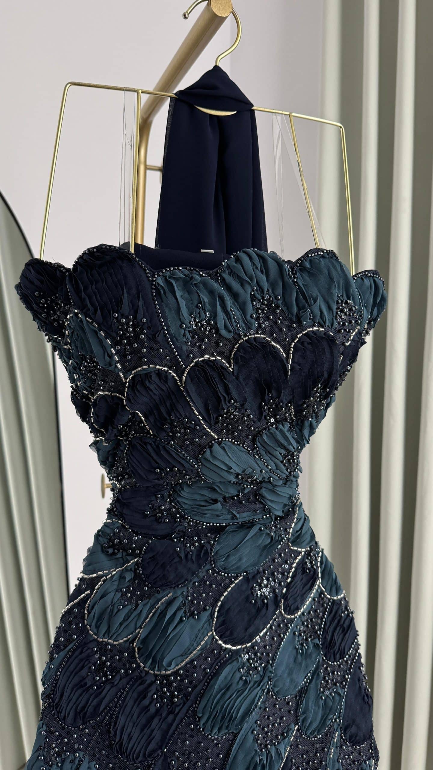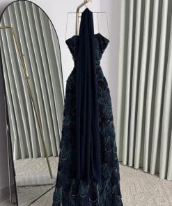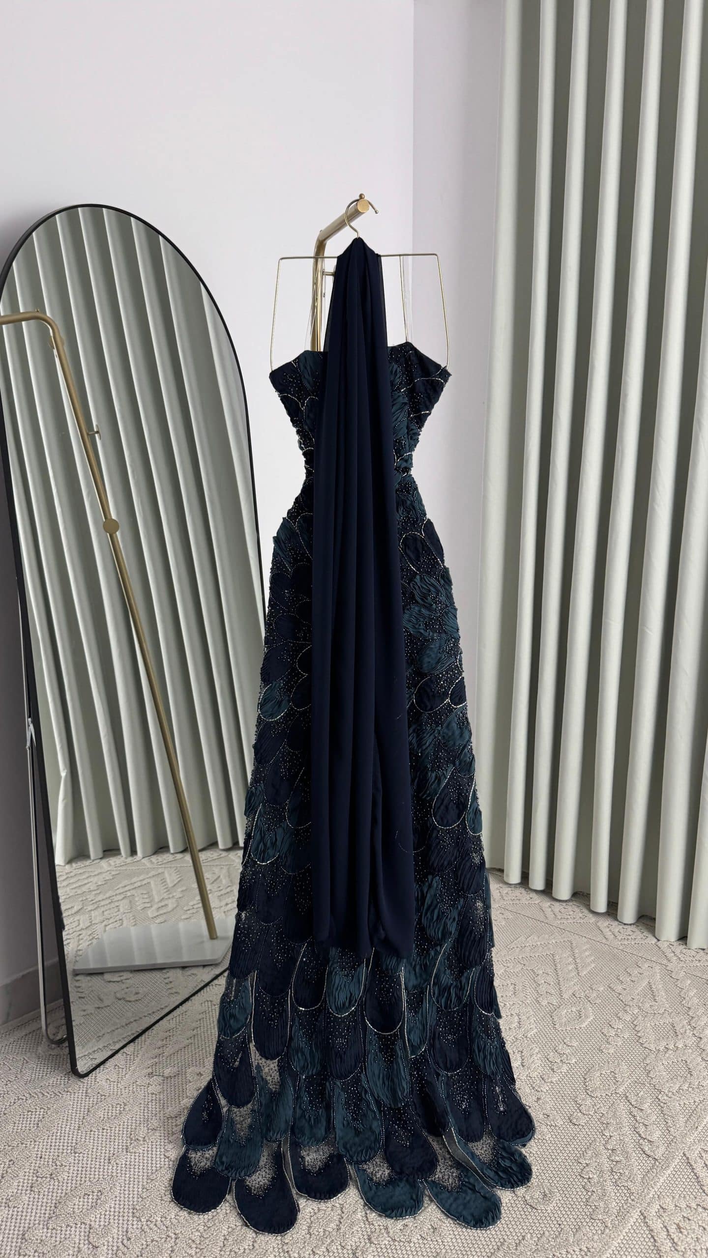 التطريز الورقي البارز يغطي الفستان بالكامل بطريقة فنية، ليمنح التصميم عمقًا وفخامة واضحة، بينما يضيف اللون الكحلي لمسة من الرقي والتميز تناسب حفلات الزفاف، الخطوبة، الاستقبالات، والسهرات الفاخرة في السعودية.