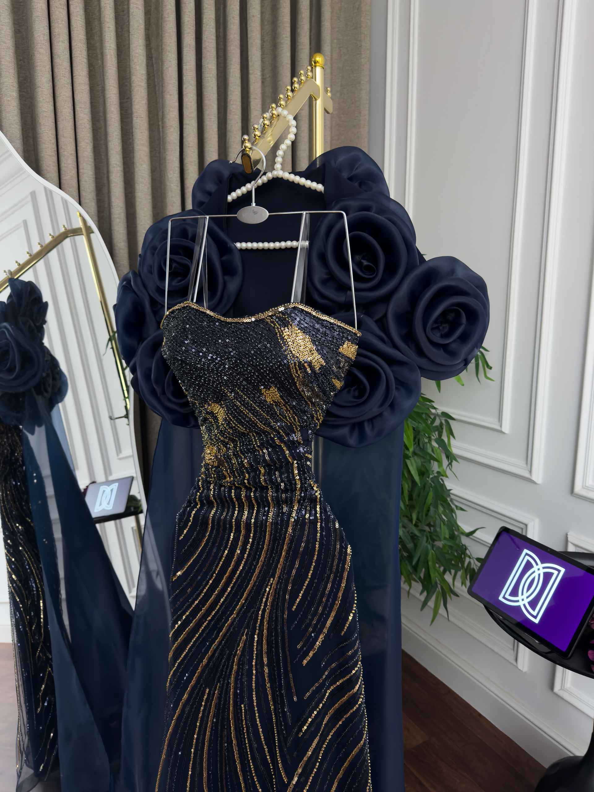 فستان سهرة كحلي فخم مطرز بالترتر الذهبي – تصميم راقٍ للمناسبات والحفلات
