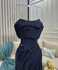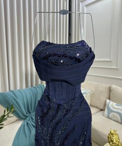 فستان سهرة كحلي مطرز بالترتر – تصميم أنيق بقصة كورسيه للمناسبات الراقية