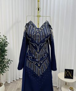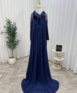 القصة المصممة بعناية مع الأكمام الطويلة تمنح الفستان طابعًا أنيقًا ومحتشمًا، بينما يضيف الذيل الخفيف لمسة فخامة ملكية عند الحركة. اللون الكحلي يُعد من أكثر ألوان فساتين السهرة طلبًا، لما يتميز به من أناقة كلاسيكية تناسب جميع ألوان البشرة.