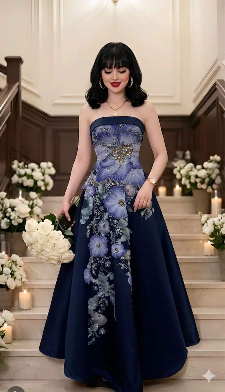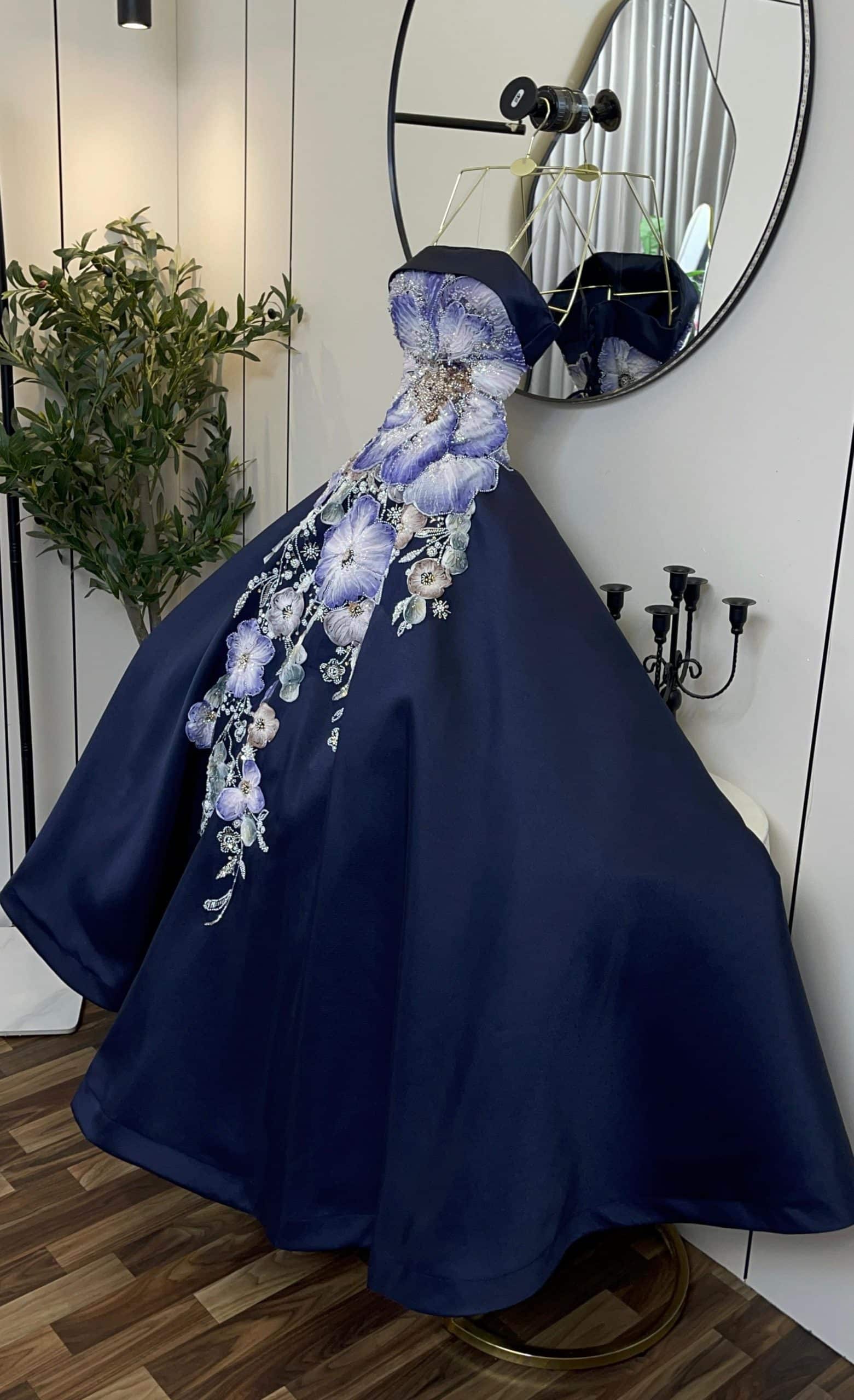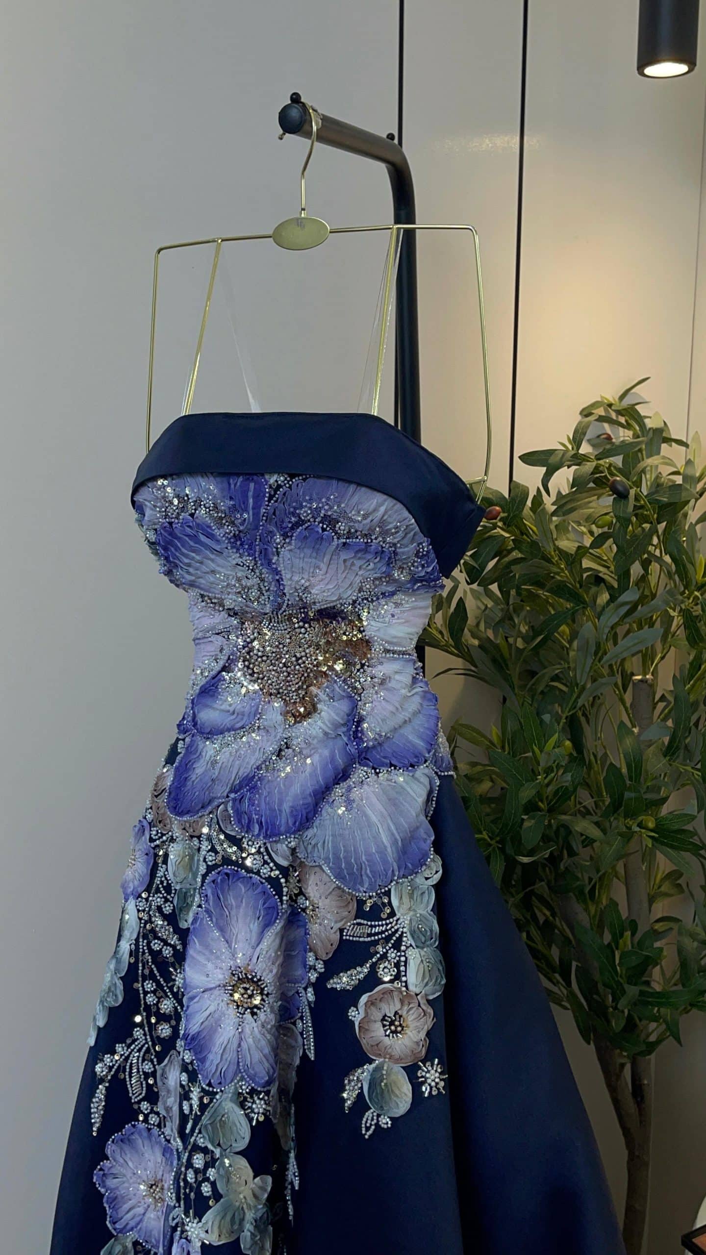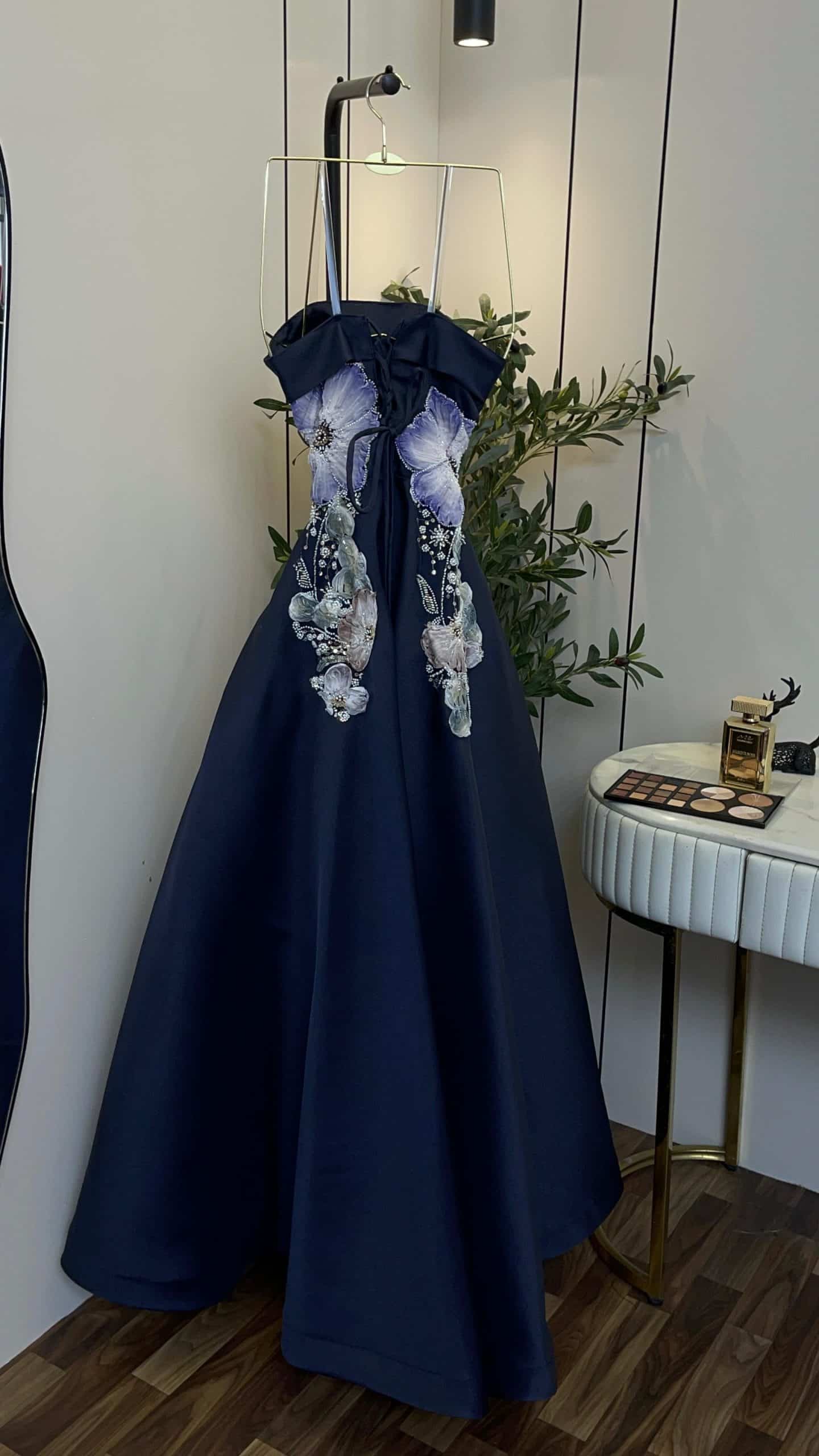 فستان سهرة أنيق باللون الكحلي بتصميم منفوش ملكي وقصة كورسيه راقية، مزين بتطريز زهور ثلاثي الأبعاد بدرجات البنفسجي والفضي مع تفاصيل لامعة تمنحك إطلالة فخمة ومميزة في المناسبات والحفلات الكبرى.