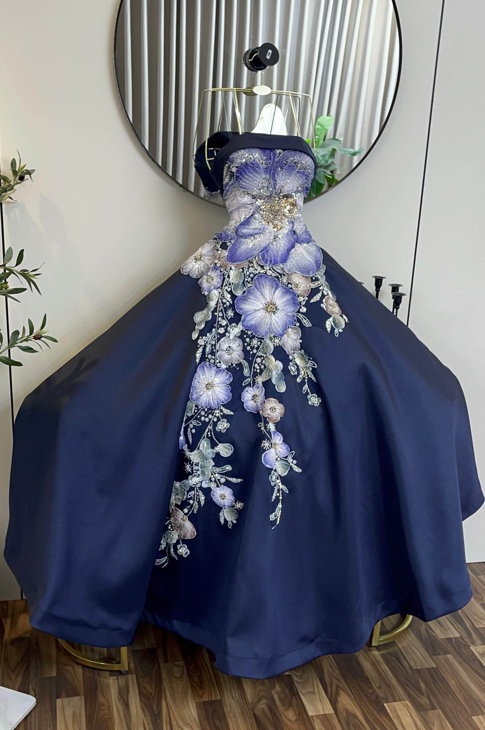 فستان سهرة كحلي منفوش بتطريز زهور ثلاثي الأبعاد فاخر