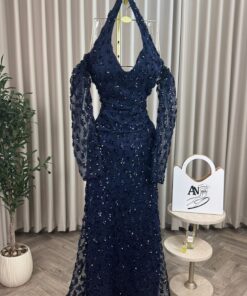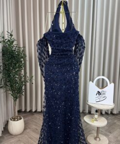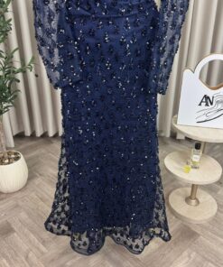 يتميز الفستان بتصميمه الفريد الذي يجمع بين الأناقة والتفاصيل المذهلة. يأتي الفستان بلون الأزرق الداكن، وهو أحد الألوان الكلاسيكية التي تضفي على مرتديته طابعًا من الفخامة. تغطي الفستان تطريزات رائعة تتناغم مع الحبات اللامعة، ما يمنحه مظهرًا جذابًا يعكس الضوء بطريقة ساحرة، مما يجعله خيارًا مثاليًا للسهرات والمناسبات الليلية