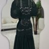 تمتاز منطقة الصدر والخصر بتطريزات براقة متقنة توزّع اللمعان بإحساس فني راقٍ، بينما تضيف الكسرات الناعمة لمسة من الانسياب والأنوثة. يجمع الفستان بين التدرّج الدرامي في القماش والتطريز اللامع ليخلق مزيجًا مثاليًا من الأناقة والعصرية.