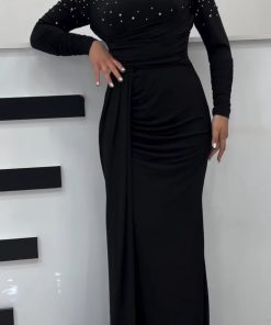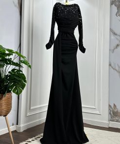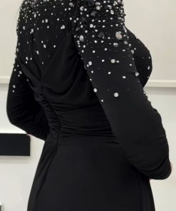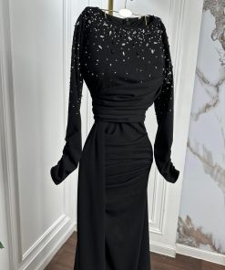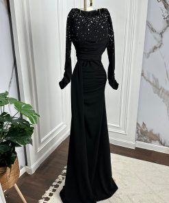 فستان سهرة لون اسود كريب تتطريز علي الصدر