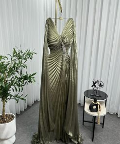 فستان سهرة فخم باللون الأخضر الزيتوني اللامع، يتميز بقصة درابيه متناسقة تمتد من الخصر إلى الأطراف بشكل فني يعزز جمال القوام. التصميم مزود بأكمام طويلة واسعة تضفي لمسة من الفخامة، مع فتحة صدر على شكل V تضيف لمسة أنثوية أنيقة. يتوسط الفستان تفاصيل كريستالية براقة على الخصر، مما يعزز من جاذبيته. القماش الشفاف اللامع وانسيابية التصميم يجعلان هذا الفستان مثالياً للسهرات والمناسبات الراقية.