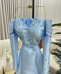 فستان سهرة طويل بلون أزرق سماوي ناعم، يتميز بتاريخ ملكية جذابة. جزء من القماش المطرز بتطريزات ناعمة وخرز بلون متناغم، مما يضفي لمسة أنثوية راقية. تتميز بتصميم فاخر أكتاف بارزة مع طيات كامل فخامة للمظهر. حمالة صدر أنيقة بأكمام طويلة وضيقة ومزينة بتطريز يكمّل تفاصيل.