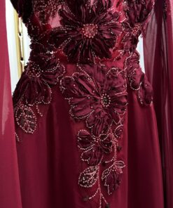 فستان يتميز بفخامة واضحة وأناقة ملفتة، ويجمع بين الطابع الكلاسيكي والأنوثة الراقية. يأتي الفستان بلون عنابي غني، يُضفي لمسة من الفخامة والرقي، ويُعتبر من الألوان التي تبرز الجمال بطريقة ساحرة.